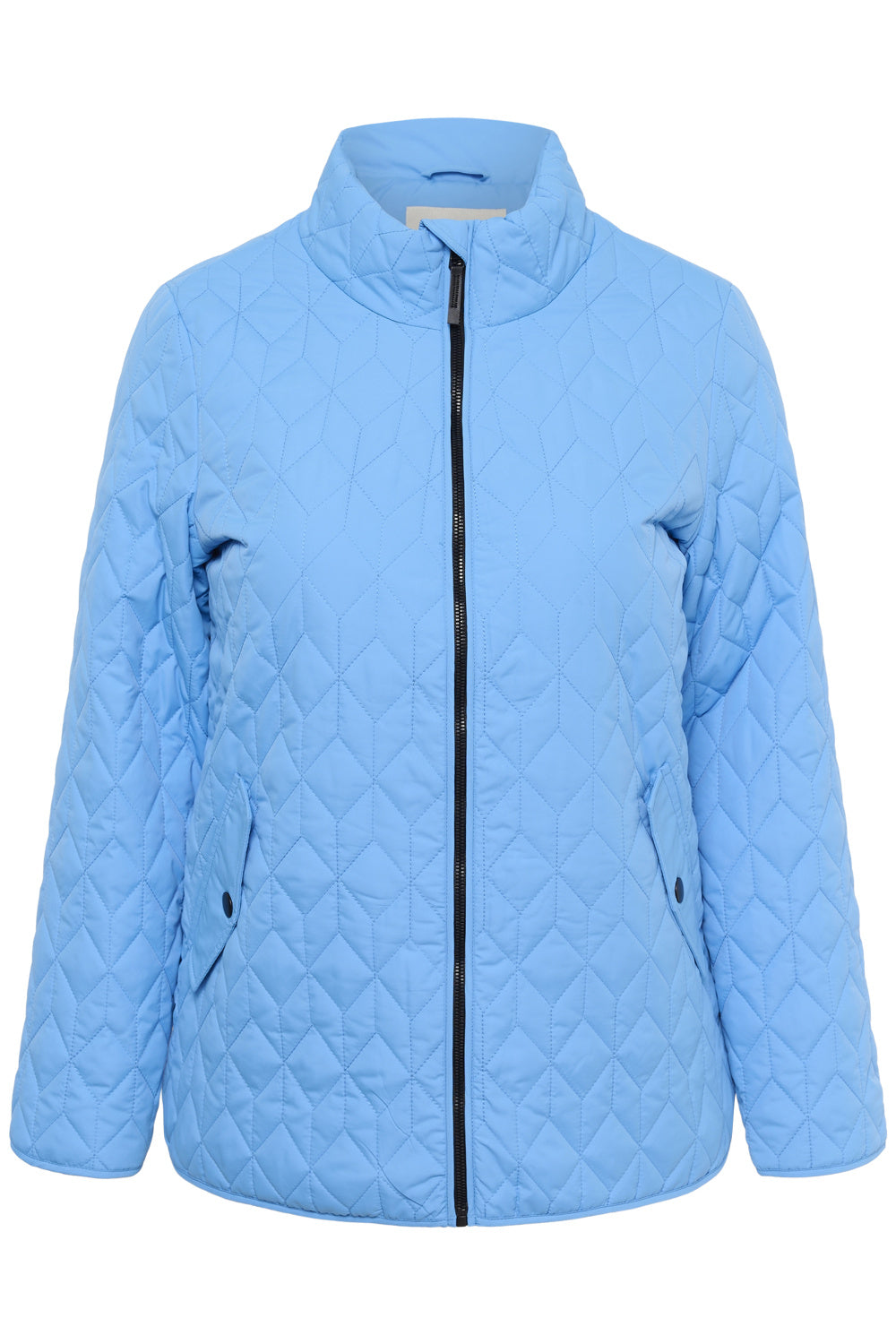 De Kaffe curve jas 10583970 is een moderne gewatteerde damesjas in een lichte tint. Dit item van DK Company is uitgevoerd in Azure Blue en kenmerkt zich door het all-over ruitpatroon. De casual overjas heeft een opstaande kraag en sluit met een zwarte ritssluiting. Aan de voorzijde vind je twee functionele steekzakken die voorzien zijn van een donkere drukknoopsluiting.