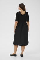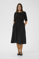 Deze stijlvolle jurk, onderdeel van de Kaffe curve collectie van DK Company, heeft een effen Black Deep uitvoering. Het dames jurkje is uitgevoerd met een bovenlijf in ribstructuur en driekwart mouwen. De ronde halslijn zorgt voor een comfortabele pasvorm. De rok is geplooid bij de taille en loopt uit in een midi lengte. Handig zijn de twee steekzakken aan de zijkanten.