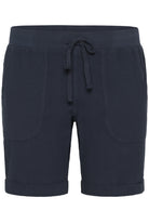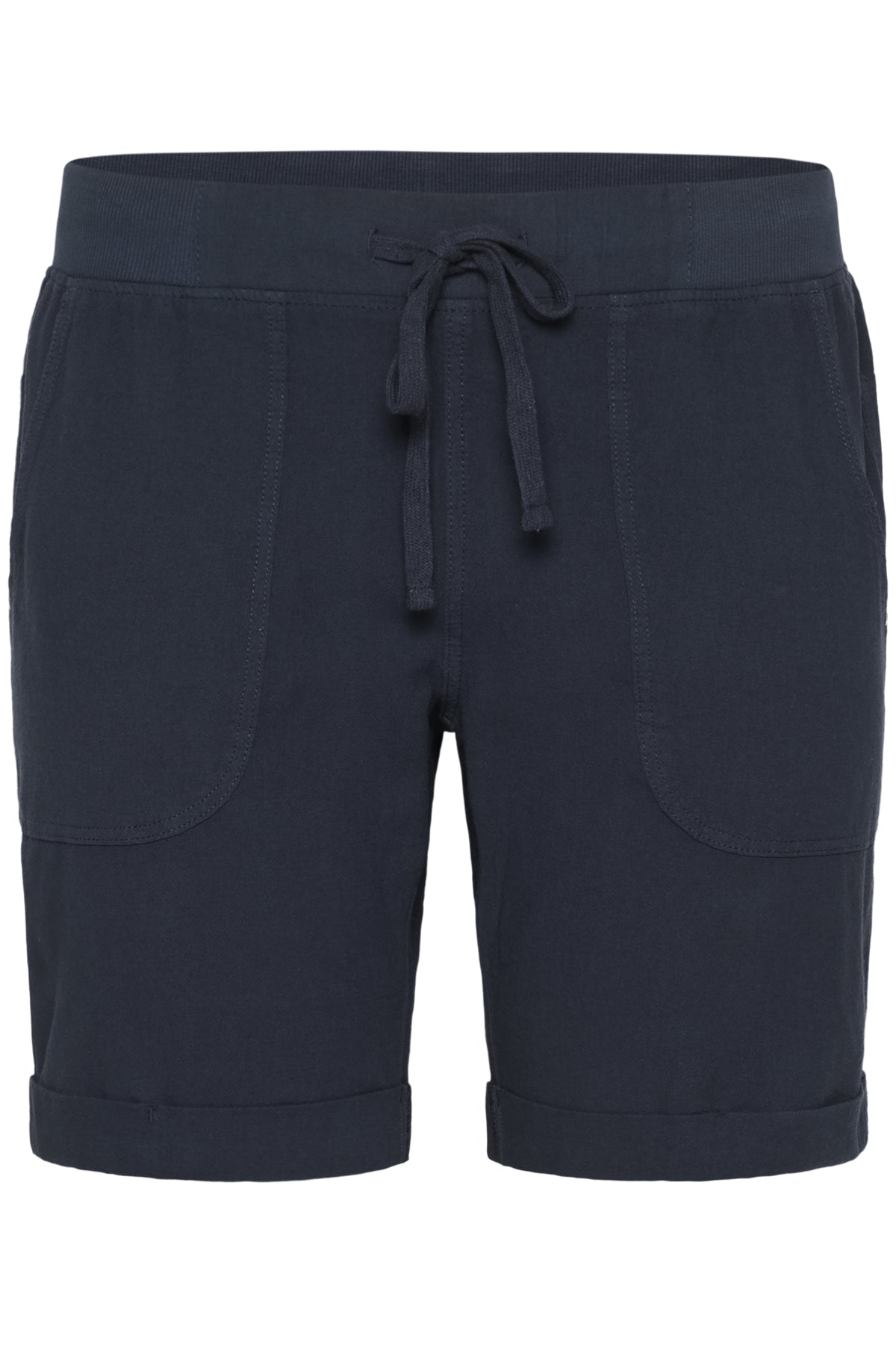 Deze donkerblauwe Kaffe Curve short heeft een elastische tailleband met een koordsluiting. Aan de voorzijde bevinden zich twee ruime steekzakken en de broekspijpen zijn afgewerkt met een vaste omslag. De achterkant van de broek is voorzien van horizontale deelnaden.