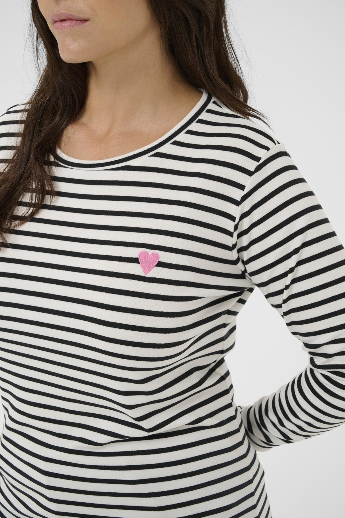 Dit Kaffe curve T-Shirt 10580179 is een longsleeve met lange mouwen, uitgevoerd in een Chalk/Black streepdessin. De stof heeft een comfortabele, aansluitende pasvorm die je makkelijk de hele dag draagt. Dit basic T-shirt is van het merk Kaffe curve, onderdeel van DK Company. Het longsleeve shirt heeft een klassieke ronde hals en is voorzien van een subtiele, geborduurde Pink Heart op de borst.