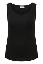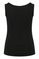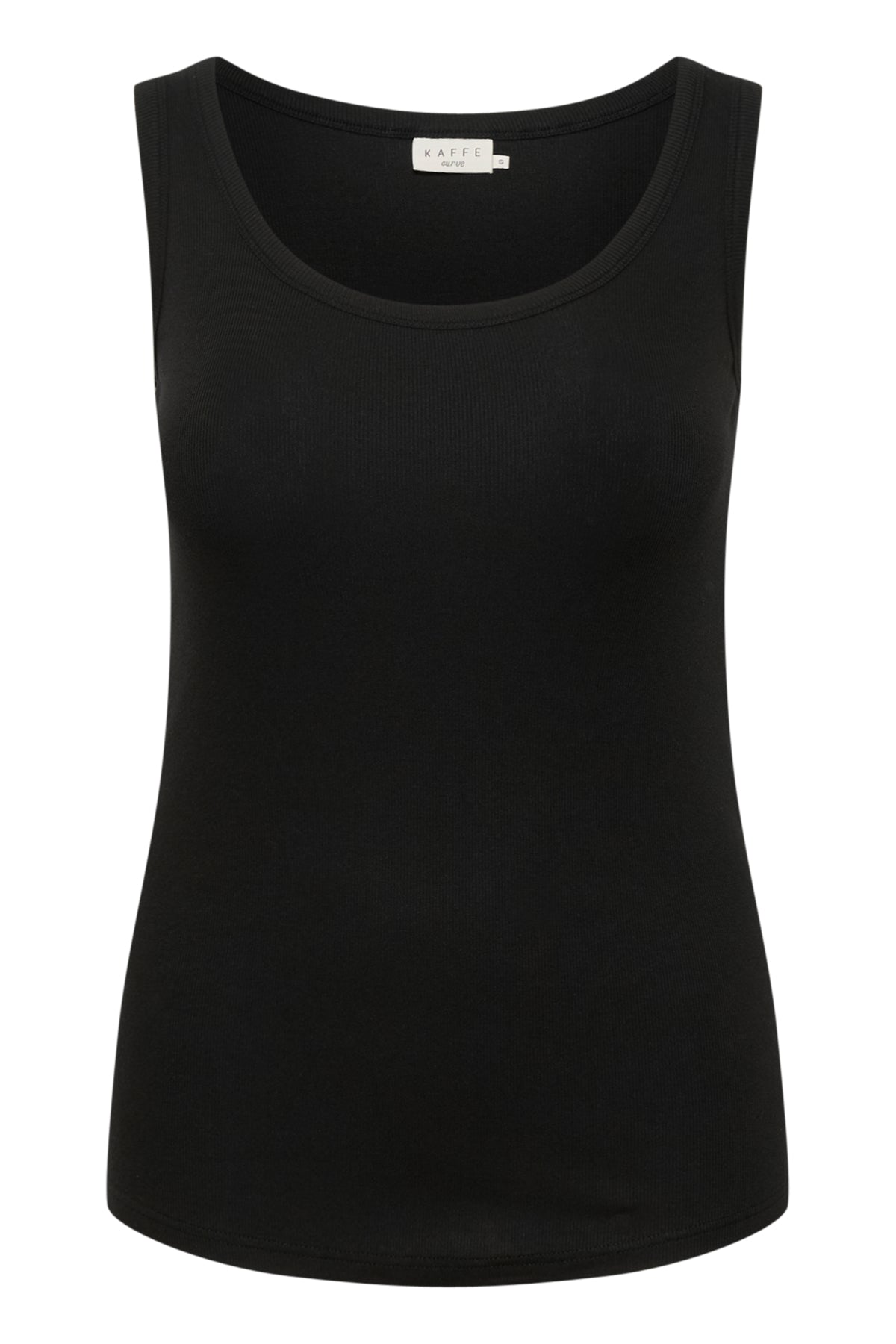 Deze mouwloze top van het merk Kaffe curve is uitgevoerd in een diepzwarte kleur met een fijne ribstructuur. Het kledingstuk is voorzien van een ronde halslijn en brede schouderbanden die zorgen voor een aansluitende pasvorm. De achterzijde van dit item is volledig gesloten en de lengte valt tot over de heup. Deze basistop is gemaakt van een zachte katoenmix met elastan voor voldoende rek.