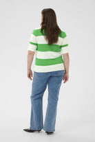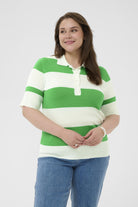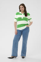 Kaffe curve Gebreide Polo Top in Chalk en Bright Green Stripe