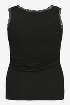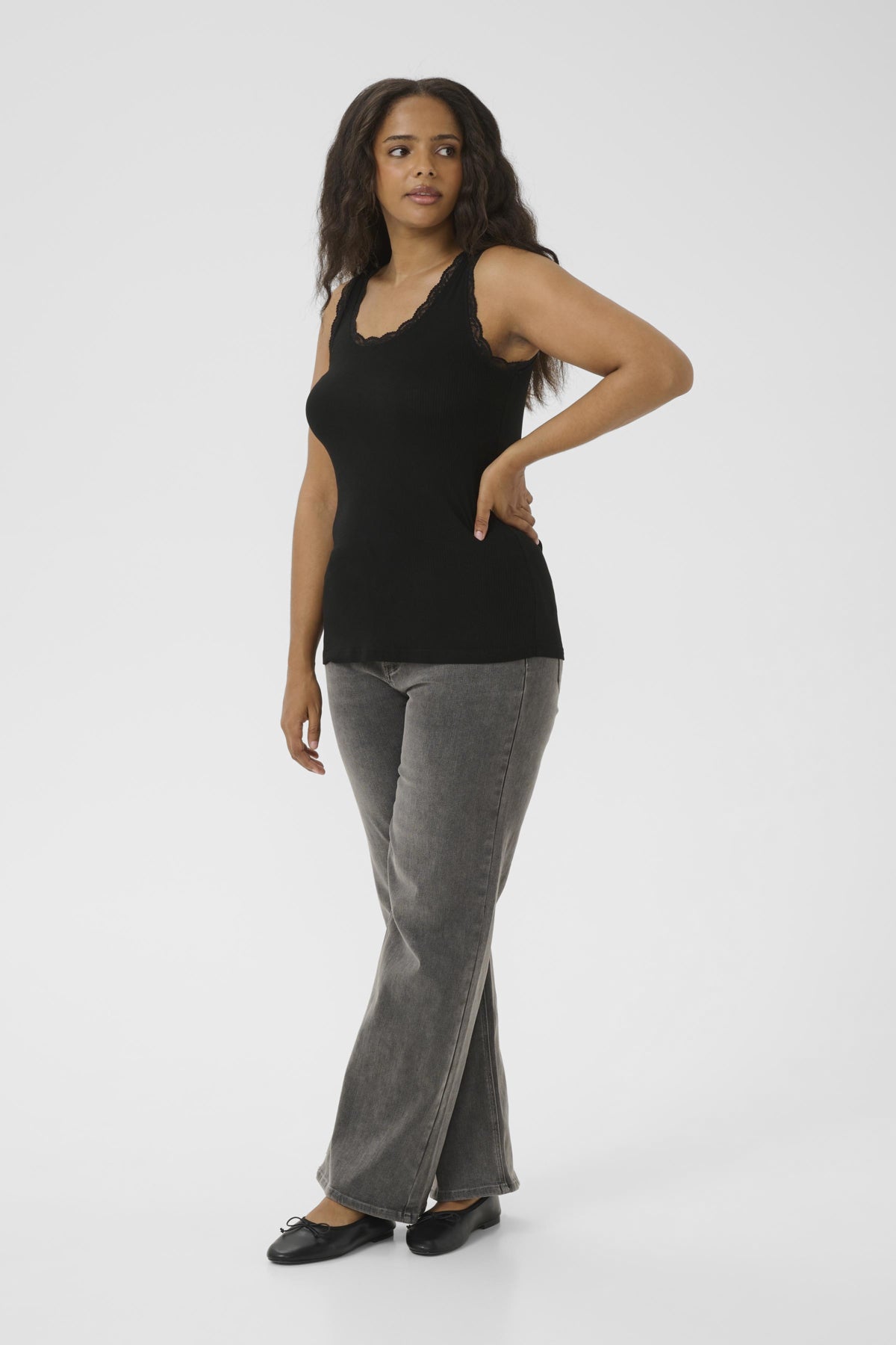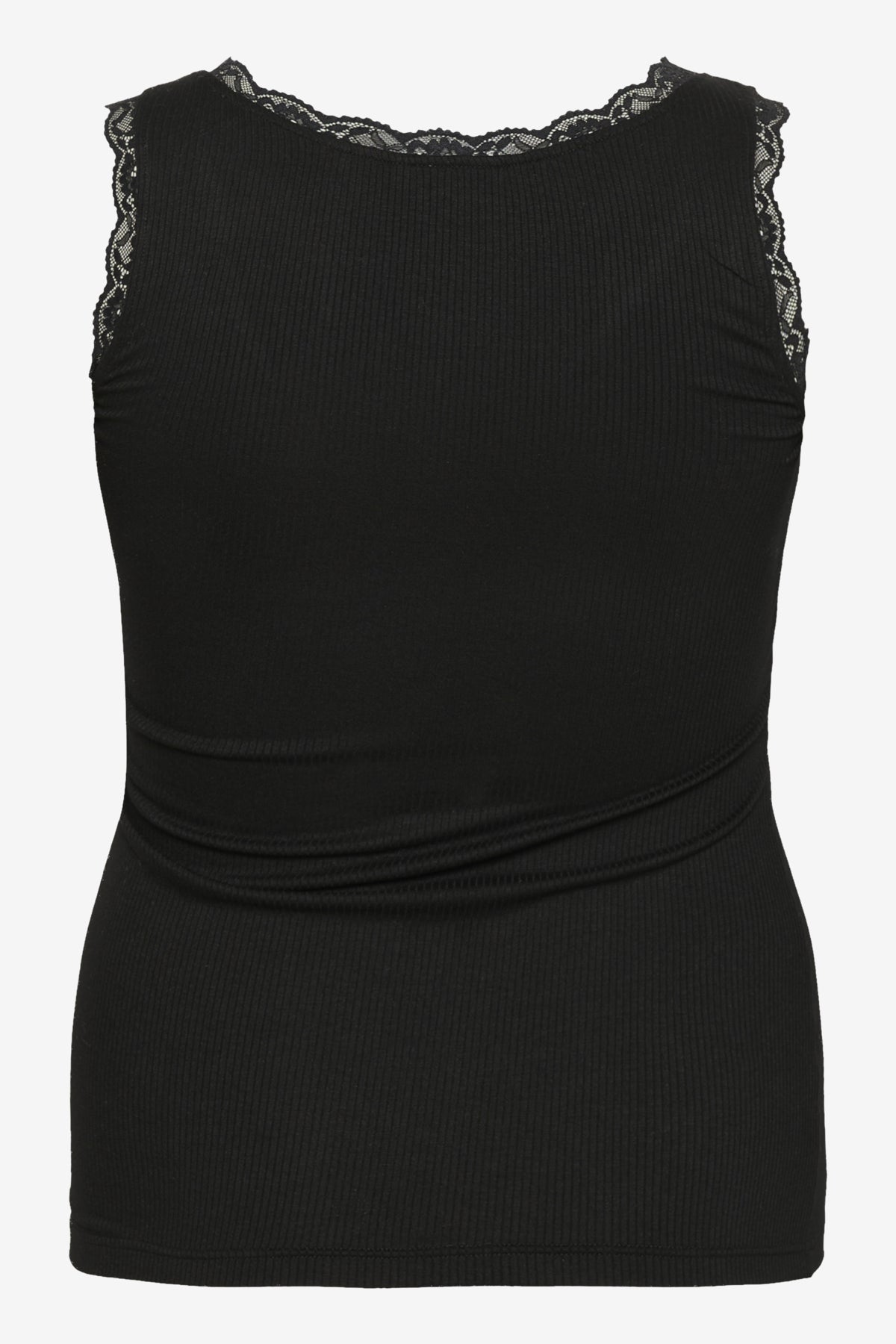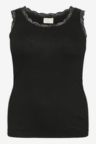 Deze zwarte ribgebreide tanktop van Kaffe curve is een aansluitend dames shirtje, uitgevoerd in een fijne ribstof. De mouwloze top heeft een klassieke ronde halslijn. Zowel de hals als de armsgaten zijn afgewerkt met een verfijnde kanten bies. Deze Kaffe curve Top 10583468 Zwart valt op reguliere lengte en is ontworpen als basis item.Pasvorm en Stijladvies