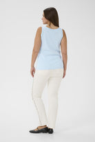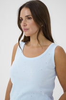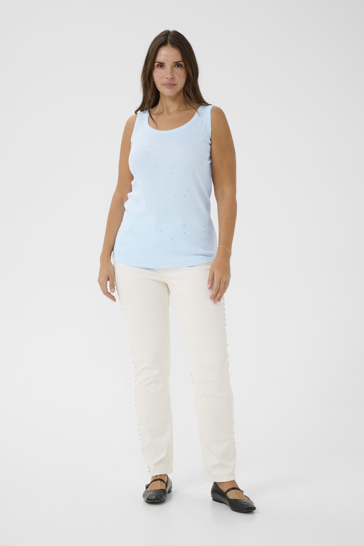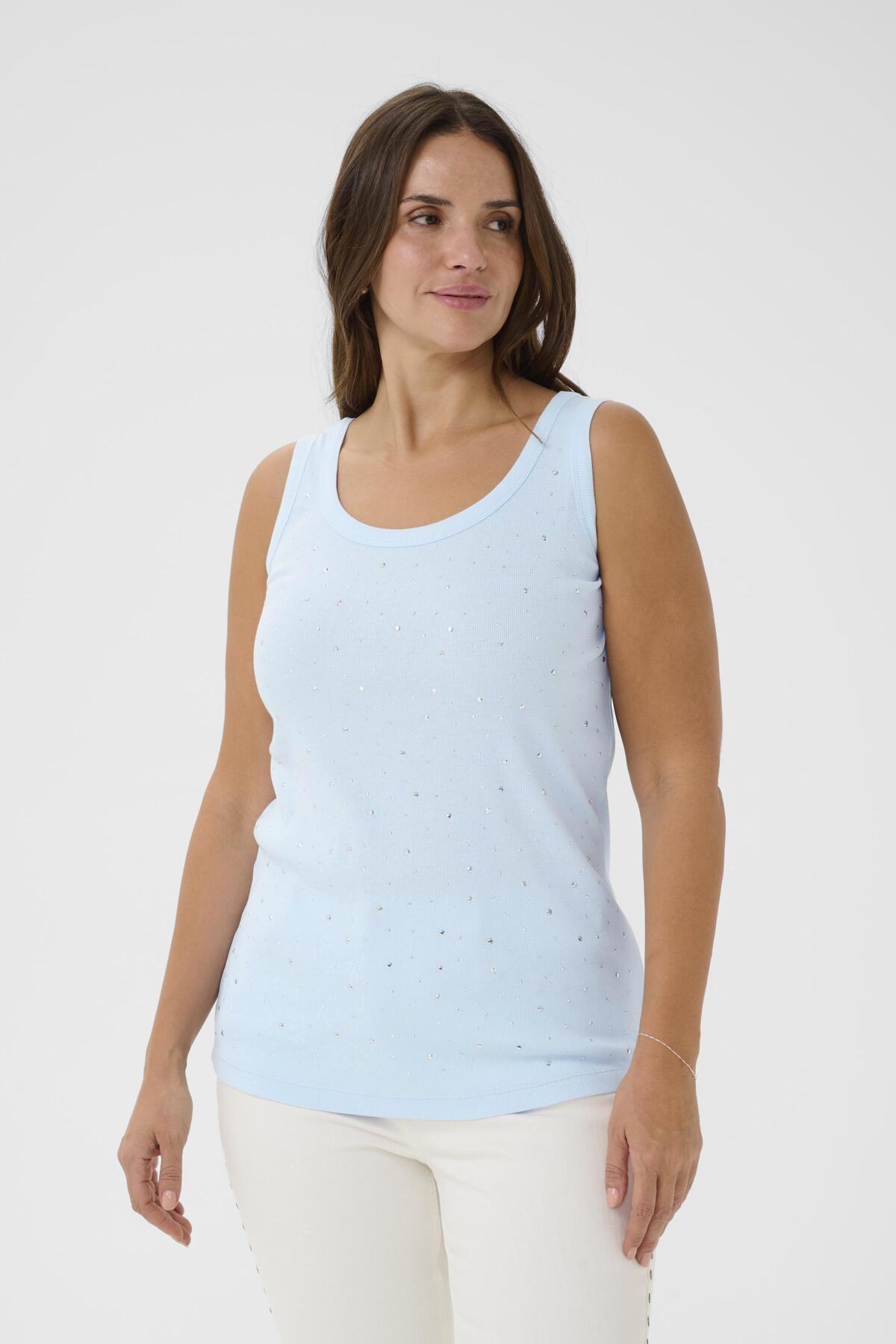 Deze mouwloze top van Kaffe curve, model 10583638 Nantucket Breeze, is uitgevoerd in een lichtblauwe ribstructuur. De dames top heeft een klassieke ronde halslijn en een rechte pasvorm. De gehele voorzijde van deze singlet is voorzien van kleine, zilverkleurige steentjes, wat een subtiele glans toevoegt aan dit kledingstuk. Deze comfortabele zomertop is gemaakt van een katoenmix met elastaan.