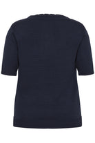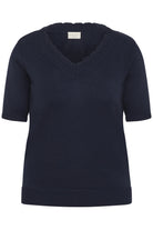 Deze fijngebreide top van Kaffe Curve is uitgevoerd in een egale donkerblauwe tint. Het kledingstuk heeft korte mouwen en een V hals met een brede ribgebreide boord. Ook de mouwuiteinden en de onderzijde van de trui zijn afgewerkt met deze ribstructuur. Het ontwerp heeft een effen dessin en valt soepel langs het lichaam voor een verzorgde uitstraling.