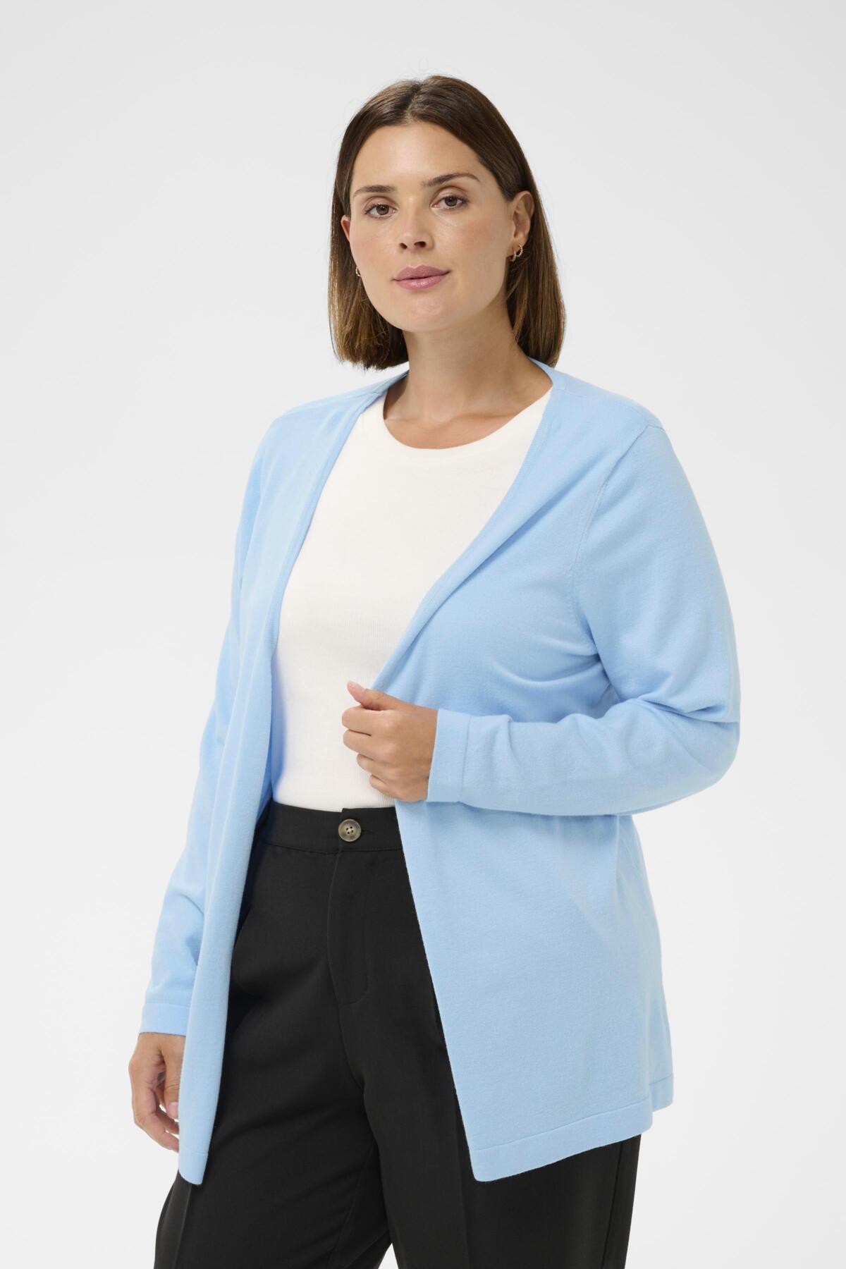Dit Kaffe curve vest in Powder Blue, met artikelnummer 10580339, is een veelzijdige toevoeging aan je garderobe. Dit fijne gebreide vestje, onderdeel van de collectie van DK Company, heeft lange mouwen en een openvallende V-hals. Het is uitgevoerd in een zachte lichtblauwe kleur en heeft een rechte pasvorm. Dit casual kledingstuk heeft ribgebreide boorden aan de mouwen en onderaan de zoom.Pasvorm en Stijladvies