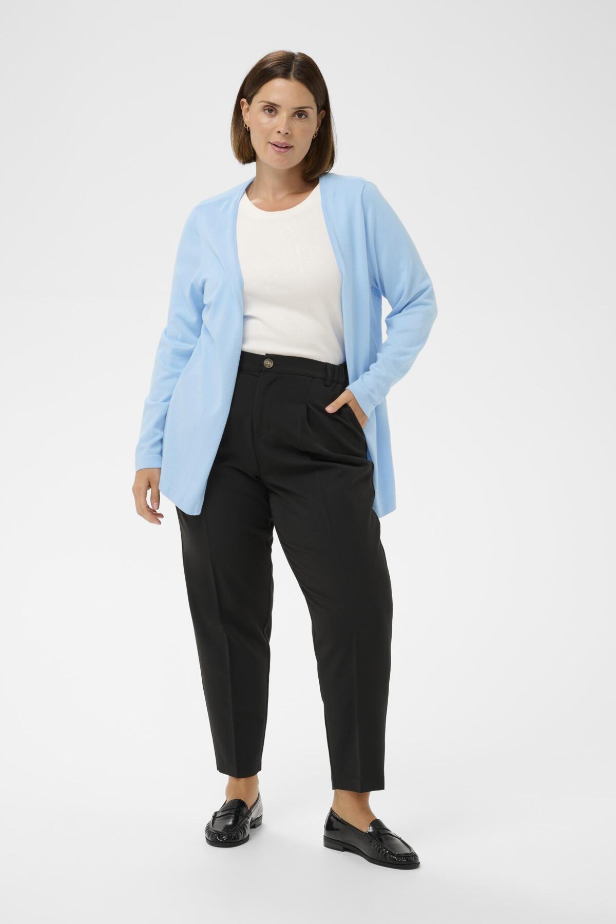De rechte pasvorm van dit vest biedt veel comfort voor dagelijks gebruik. Je kunt dit lichtblauwe vest combineren met een witte basic top en een donkere pantalon, zoals een zwarte of navy variant, voor een moderne, casual look. Ontdek meer comfortabele kleding van Kaffe curve.Productkenmerken