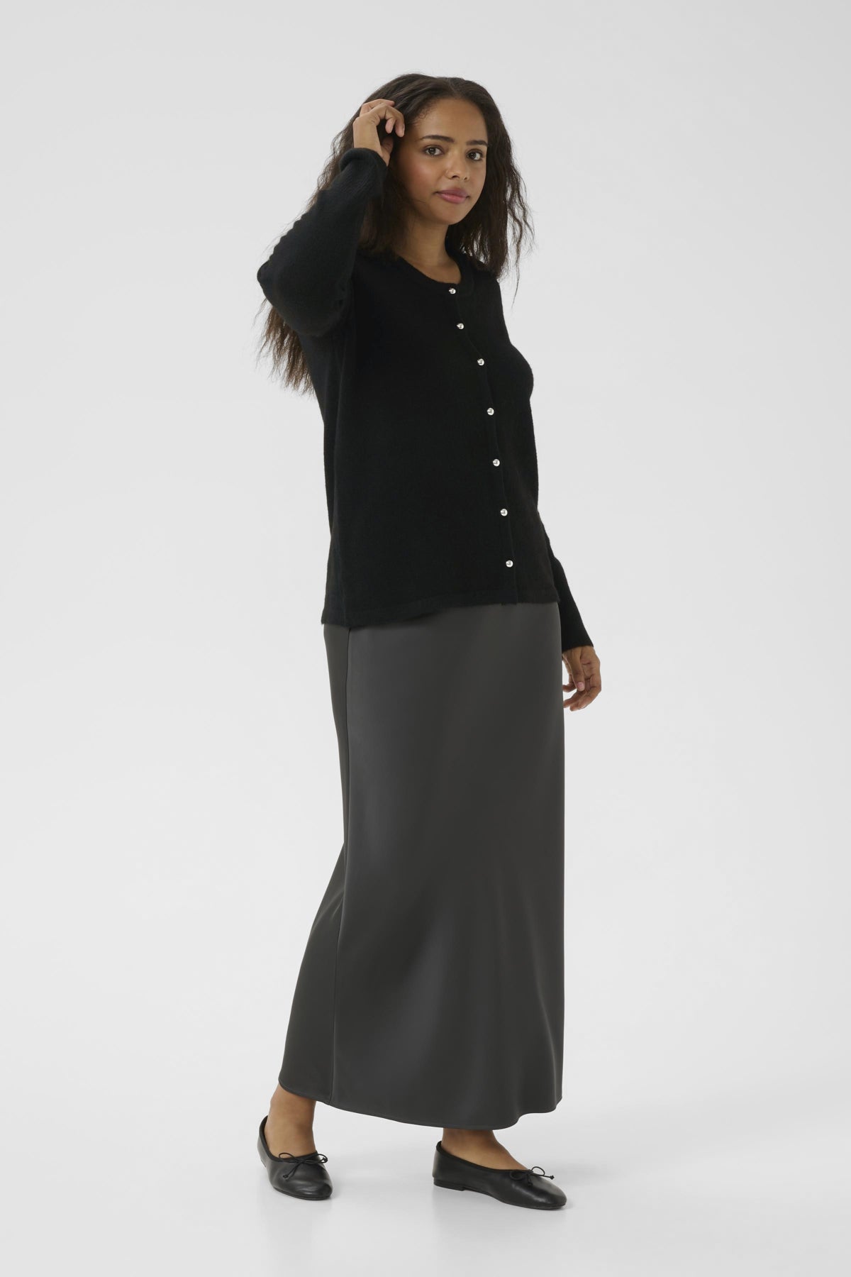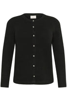 Dit zwarte gebreide vest 10583699 van Kaffe curve is een comfortabel kledingstuk voor dames. Het vest met lange mouwen heeft een ronde halslijn. Het gebreide vest sluit aan de voorzijde met zes opvallende zilverkleurige knopen. De mouwuiteinden en de onderkant zijn afgewerkt met ribgebreide boorden. Dit zwarte vest is casual en makkelijk te combineren.