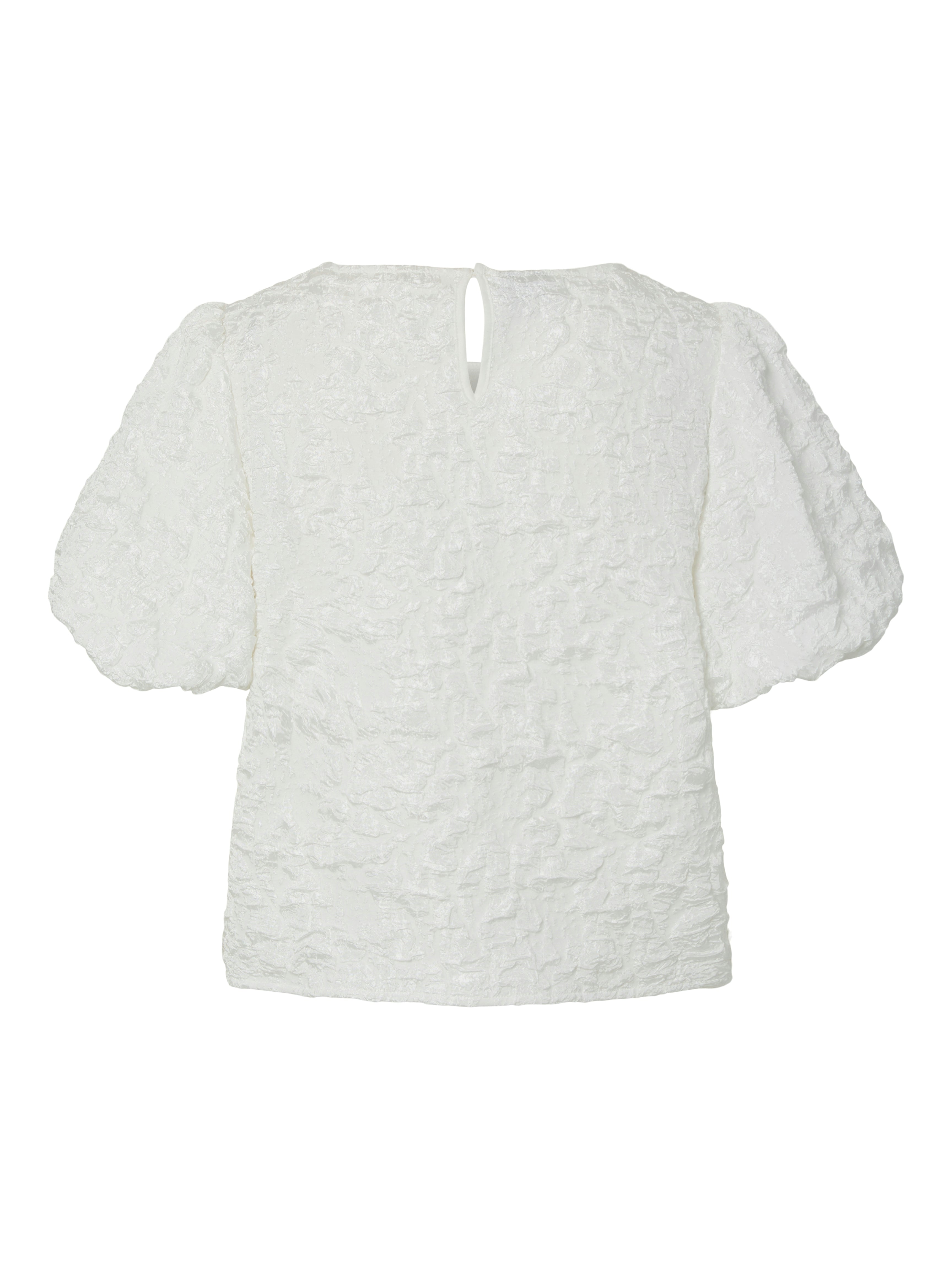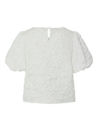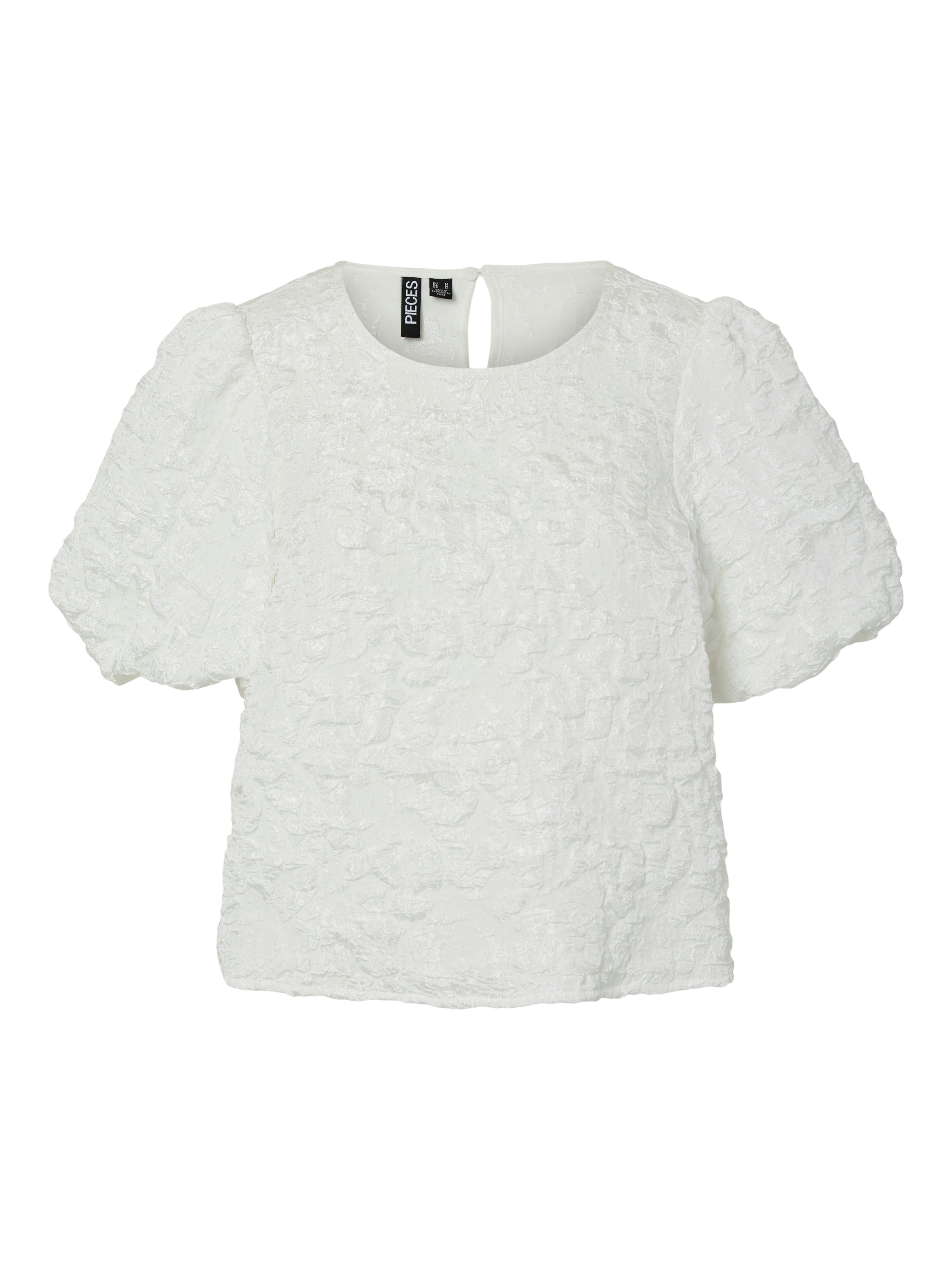 Deze witte blouse van Pieces Curve heeft een opvallende textuur in de stof. Het item is voorzien van een ronde hals en korte pofmouwen die tot de elleboog vallen. Aan de achterkant bevindt zich een keyhole opening met een knoopsluiting. De kleur Cloud Dancer en het reliëf in het materiaal bepalen de uitstraling van dit kledingstuk.