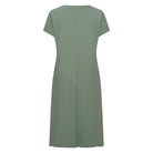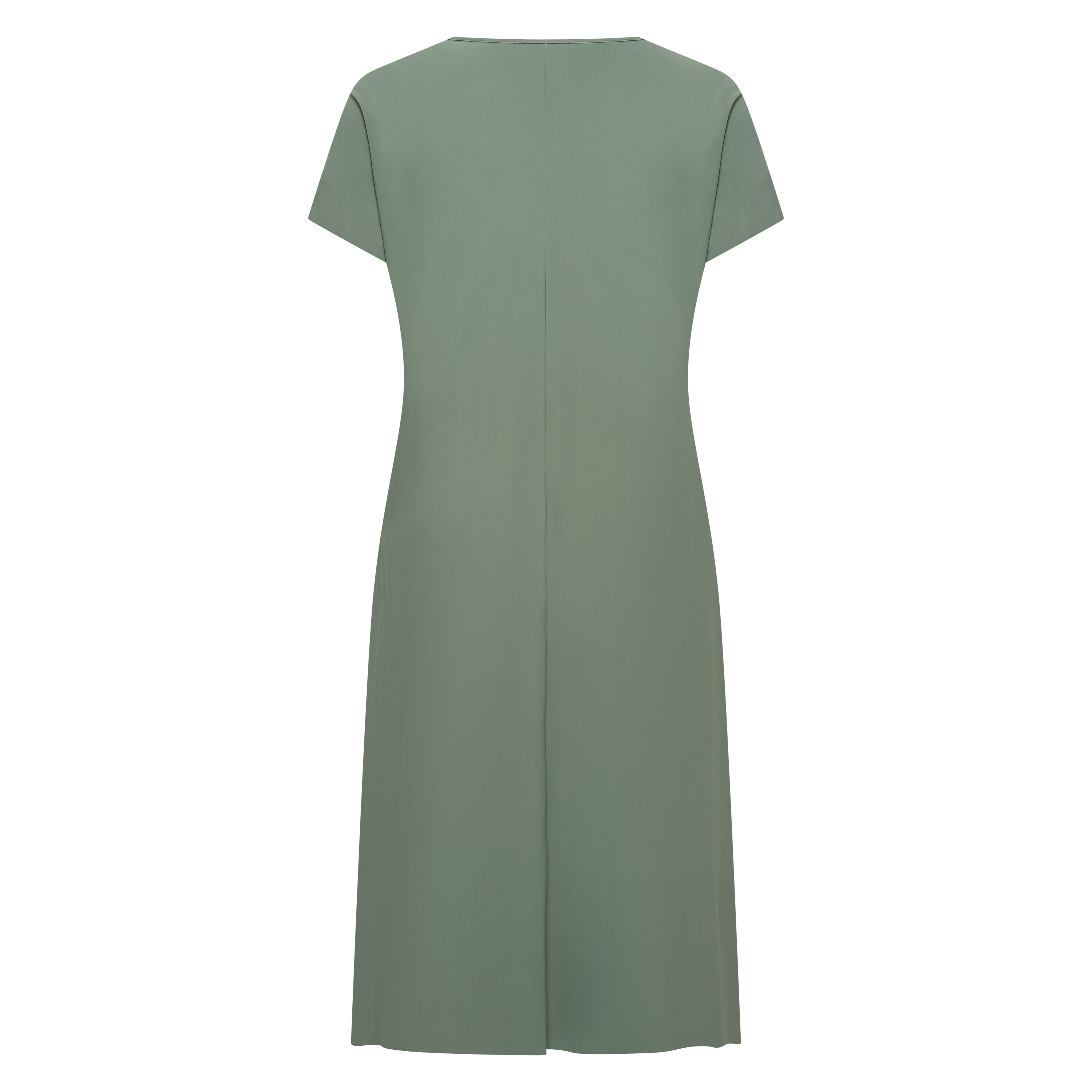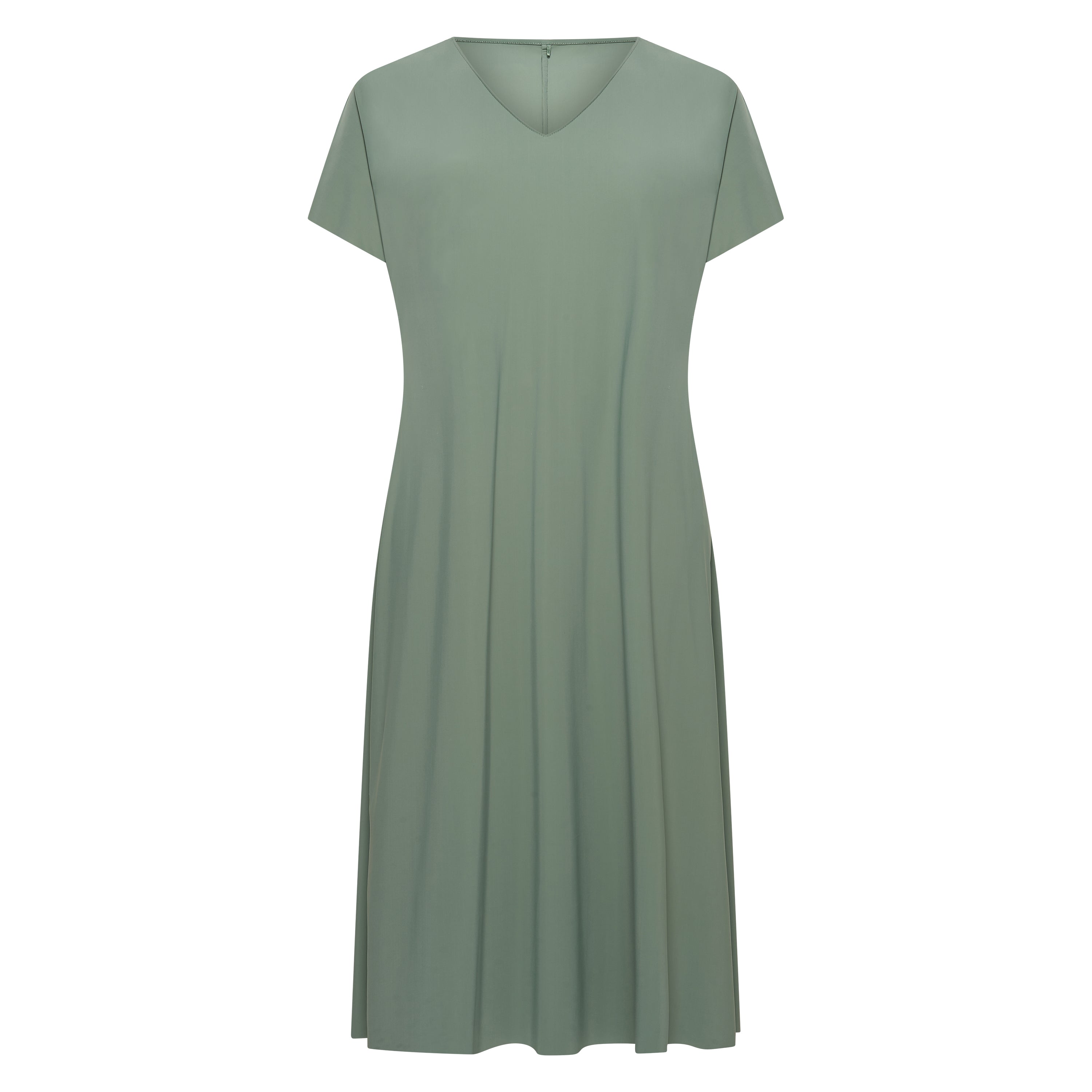 Deze groene PlusBasics midi jurk heeft een minimalistisch ontwerp met een V-hals en korte mouwen. De stof bestaat uit een polyamide-mix met stretch voor een gladde valling langs je lichaam. Je draagt dit item gemakkelijk op diverse dagen. Het ontwerp heeft een verticale naad aan de achterzijde en een egale kleur die rust uitstraalt.