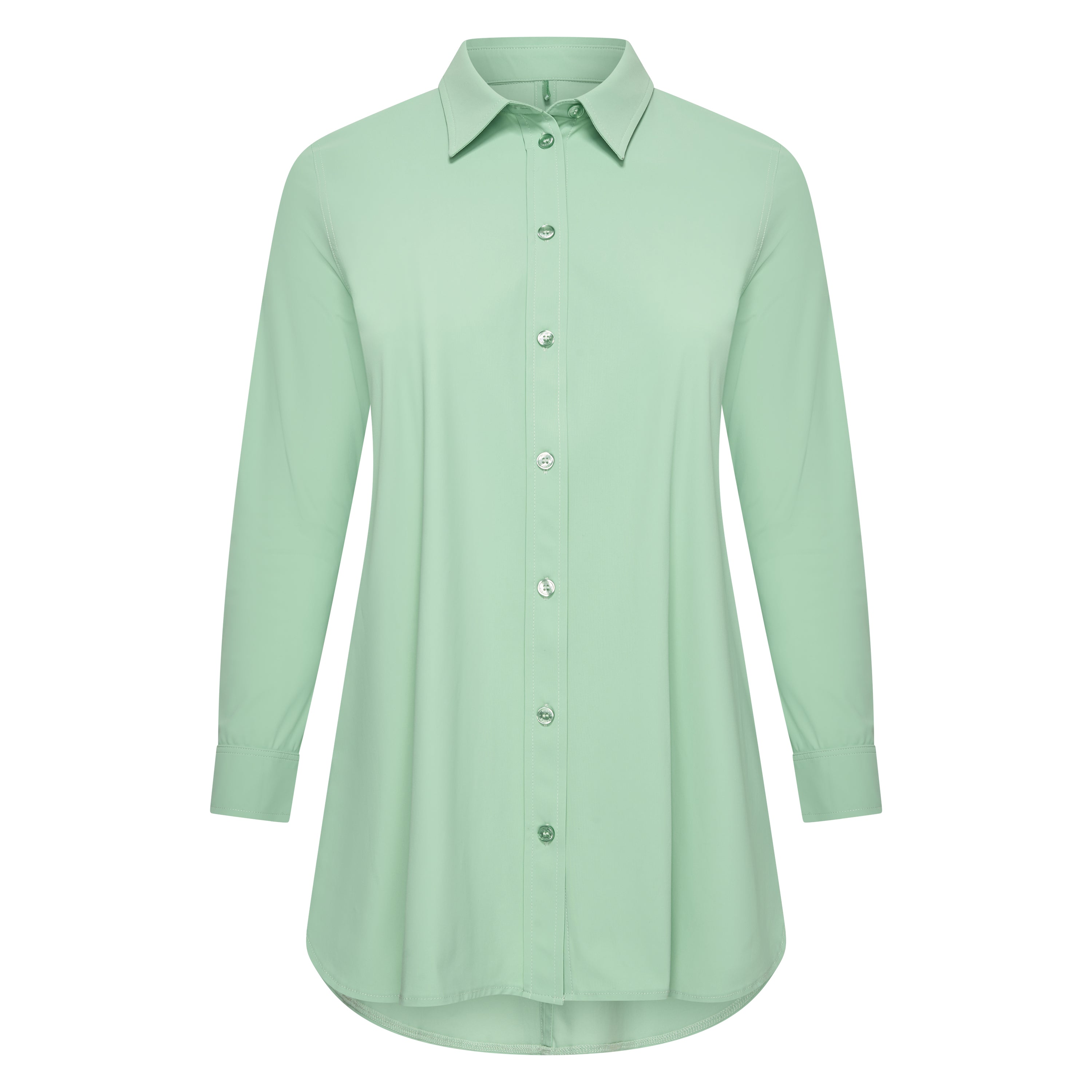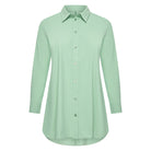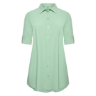 Deze PlusBasics blouse is een vlotvallend overhemd in een effen, lichte groene tint. Het lange mouwen hemd is voorzien van een klassieke kraag en een doorlopende knoopsluiting aan de voorzijde. De lange mouwen met manchetten kun je dankzij de extra knoop ook opgerold dragen voor een kortere lengte. Dit kledingstuk heeft een comfortabele, lange pasvorm en de zoom is aan de onderkant afgerond.