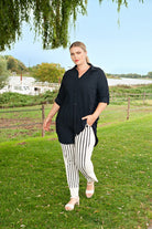 De PlusBasics Broek 18 201 064 is een comfortabele gestreepte broek, uitgevoerd in een witte kleur met donkere verticale strepen. Deze enkellange damesbroek is voorzien van een vaste omslag aan de pijpen. Aan de voorzijde, op de heup, zijn vier grote donkere knopen bevestigd als opvallend detail. De pasvorm is recht en biedt jou een casual uitstraling. Deze PlusBasics pantalon is een toegankelijke keuze voor je moderne garderobe.Pasvorm en Stijladvies