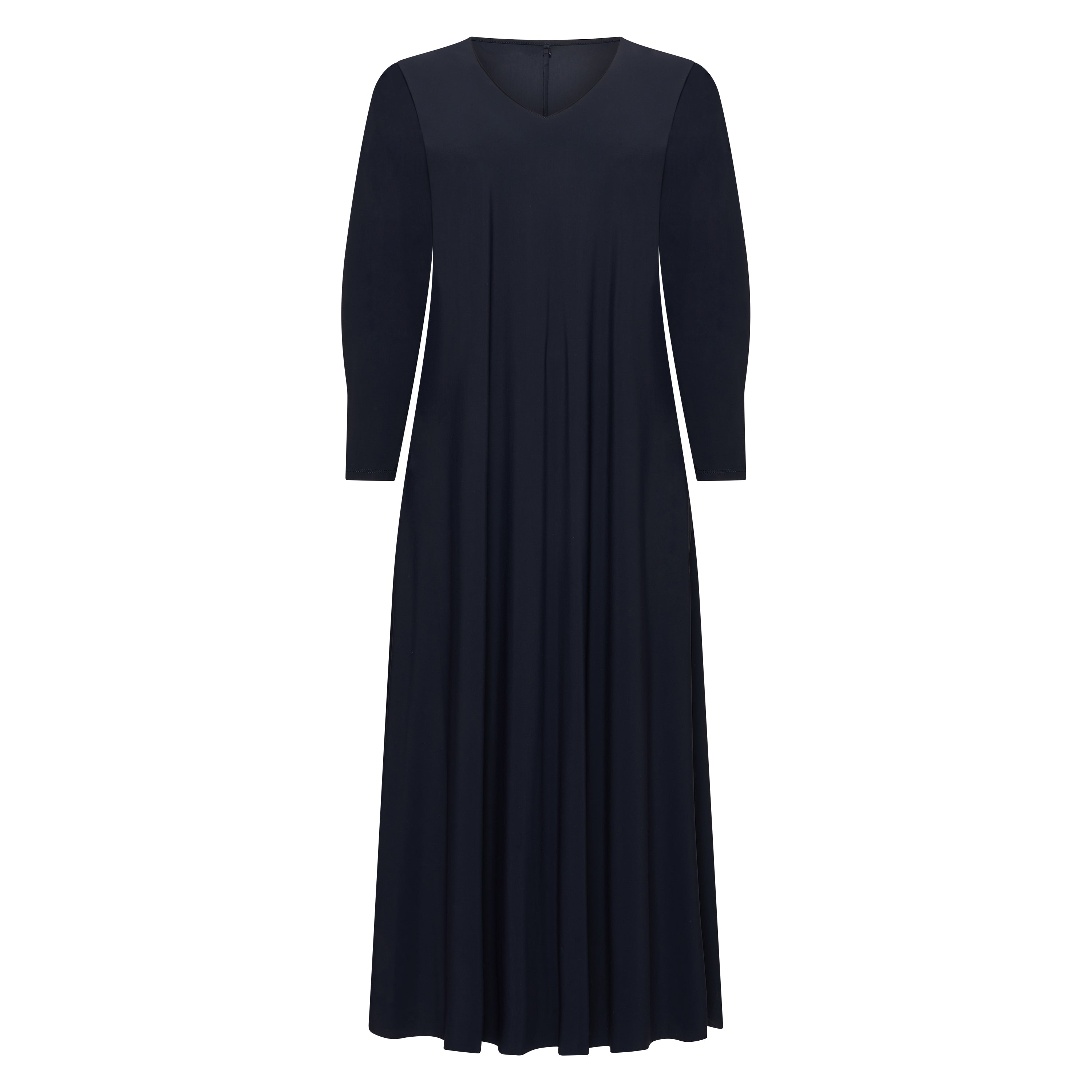 Deze donkerblauwe dames jurk van het merk PlusBasics heeft een maxi lengte en lange mouwen. Het kledingstuk is uitgevoerd met een V-hals en een korte ritssluiting die discreet in de achterzijde van de halslijn is verwerkt. De soepelvallende PlusBasics jurk valt los vanaf de borstlijn en heeft een geplooide voorkant, wat zorgt voor een comfortabele pasvorm. Dit effen donkere kledingstuk is een tijdloze aanvulling op je garderobe.