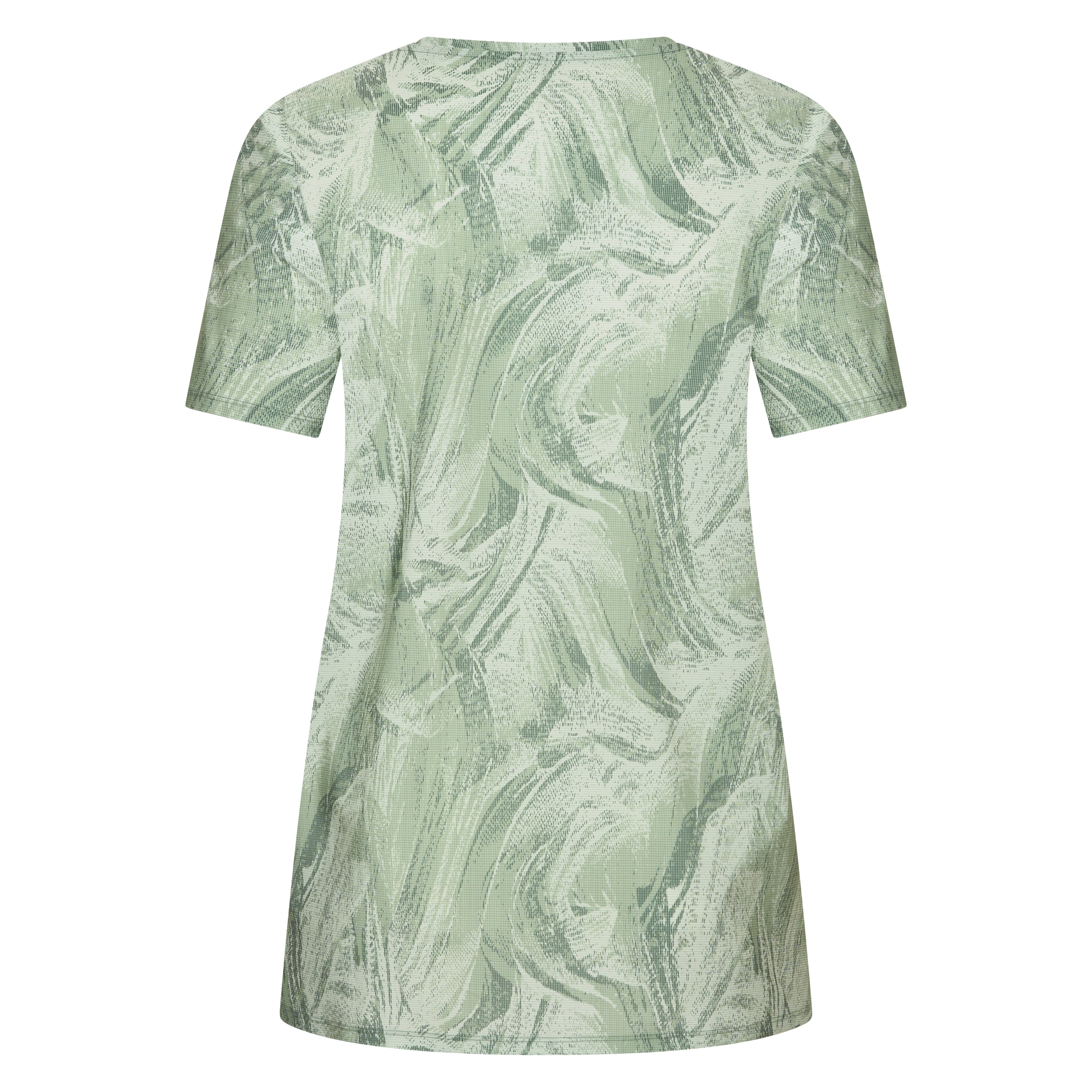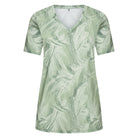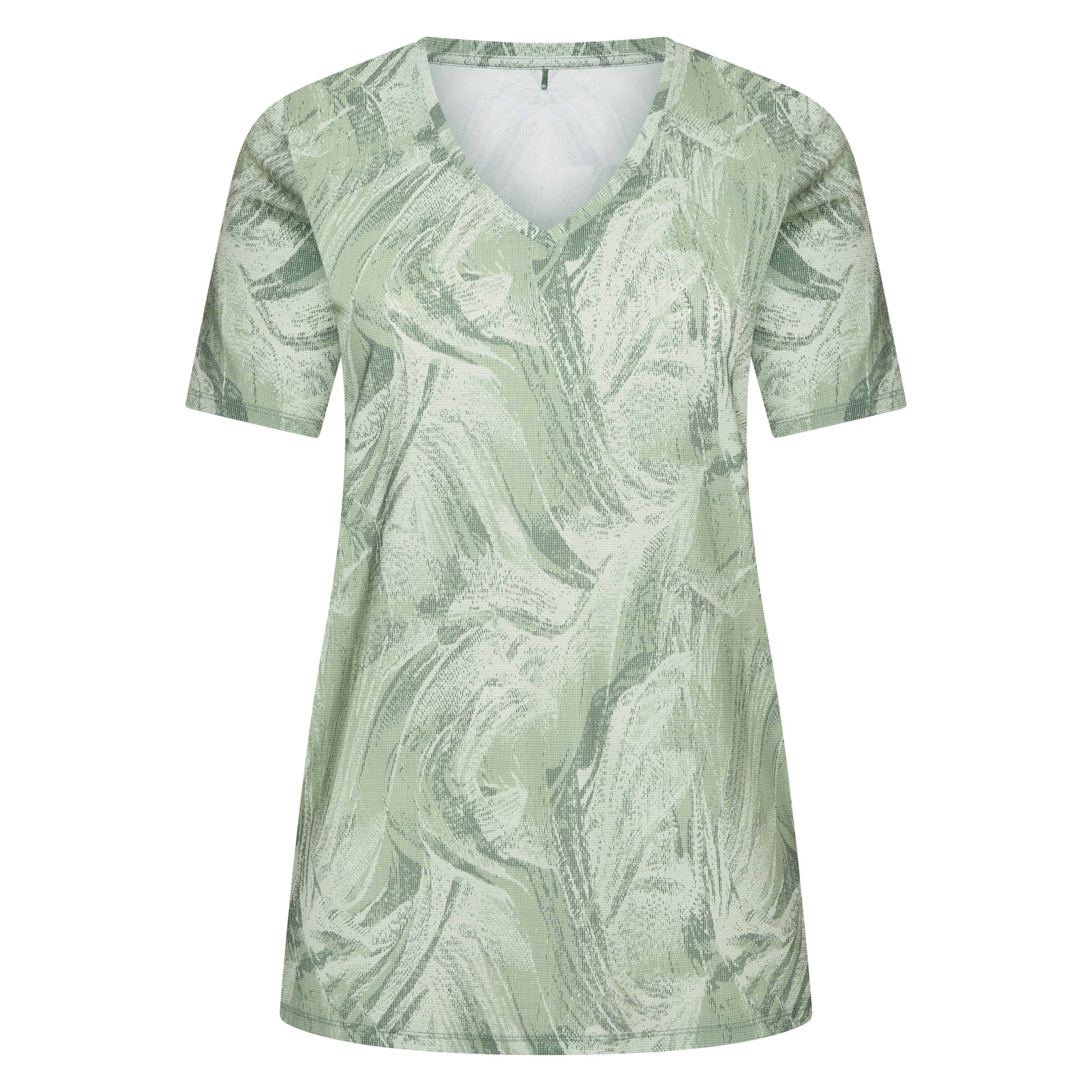 Dit lange T-shirt van PlusBasics is uitgevoerd in een donkergroene kleur en voorzien van een all-over abstract patroon. Het casual bovenstuk is afgewerkt met een V-hals en heeft korte mouwen. De snit van dit shirt is recht en valt soepel, waardoor het een comfortabel kledingstuk is dat je eenvoudig combineert. Dit PlusBasics damesshirt is een uitstekende basis voor een moderne, optimistische look.
