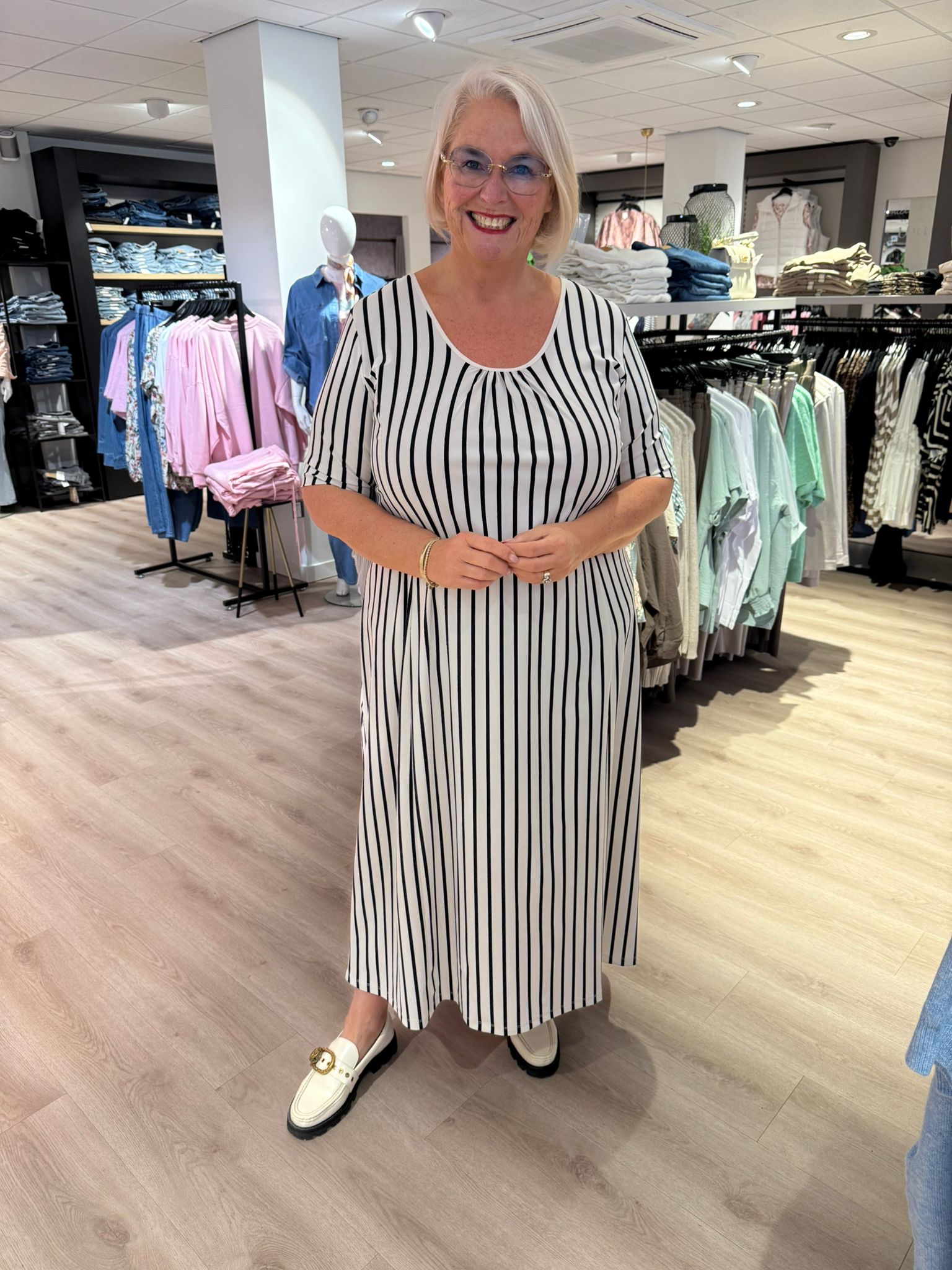 De losse pasvorm zorgt voor een aangenaam draagcomfort. Je combineert deze gestreepte jurk makkelijk met een paar witte sneakers of loafers voor een casual, toegankelijke look. Wil je meer kleding in grotere maten zien die passen bij jouw moderne levensstijl? Bekijk dan de volledige collectie van PlusBasics.Productkenmerken