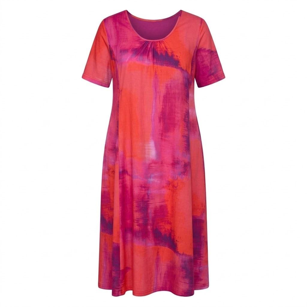 Deze PlusBasics Top 18 261 602 in de kleur Bright Batik heeft een ronde hals met kleine plooitjes aan de voorzijde. Dit item van PlusBasics is voorzien van korte mouwen en een meerkleurige print in fuchsia en paarse tinten. Het kledingstuk heeft een uitlopende vorm en een lengte die tot over de knie reikt.