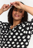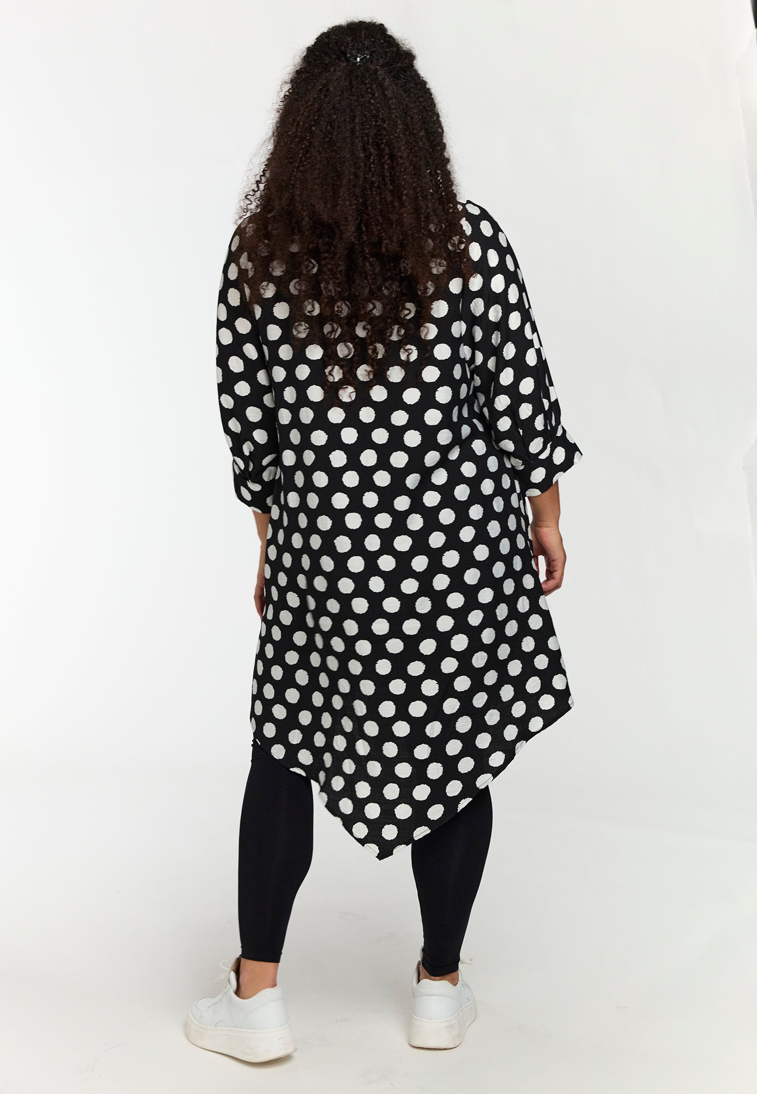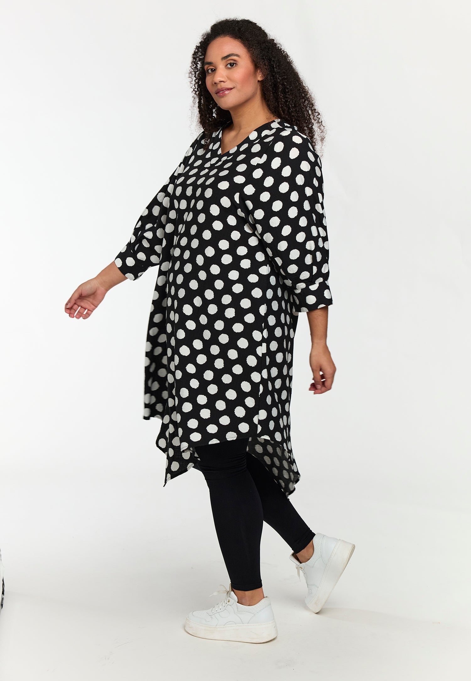 Deze comfortabele Studio tuniek jurk heeft een zwart-wit stippendessin en een wijde A-lijn pasvorm. Het ontwerp beschikt over een V-hals die als een lichte overslag valt. Deze tuniek kenmerkt zich door een asymmetrische zoomlijn, waarbij de lengte aan de zijkanten langer is. De driekwart mouwen zijn afgewerkt met een opgerolde manchet. De Studio collectie is gespecialiseerd in kleding voor grote maten, wat zorgt voor een hoog draagcomfort en veel bewegingsvrijheid.