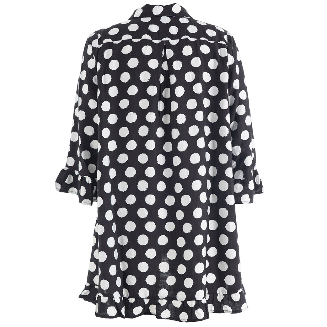 Deze Studio Tuniek S261807 Zwart/Wit van Studio is een lange blouse met een opvallend stippen dessin. Het kledingstuk heeft een klassieke overhemdkraag en een knoopsluiting over de gehele lengte aan de voorzijde. De driekwart mouwen en de asymmetrische zoom zijn afgewerkt met een subtiele volantrand. Dit model van Sandgaard is casual en toegankelijk, en geeft je outfit een speelse uitstraling.