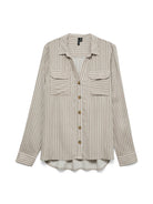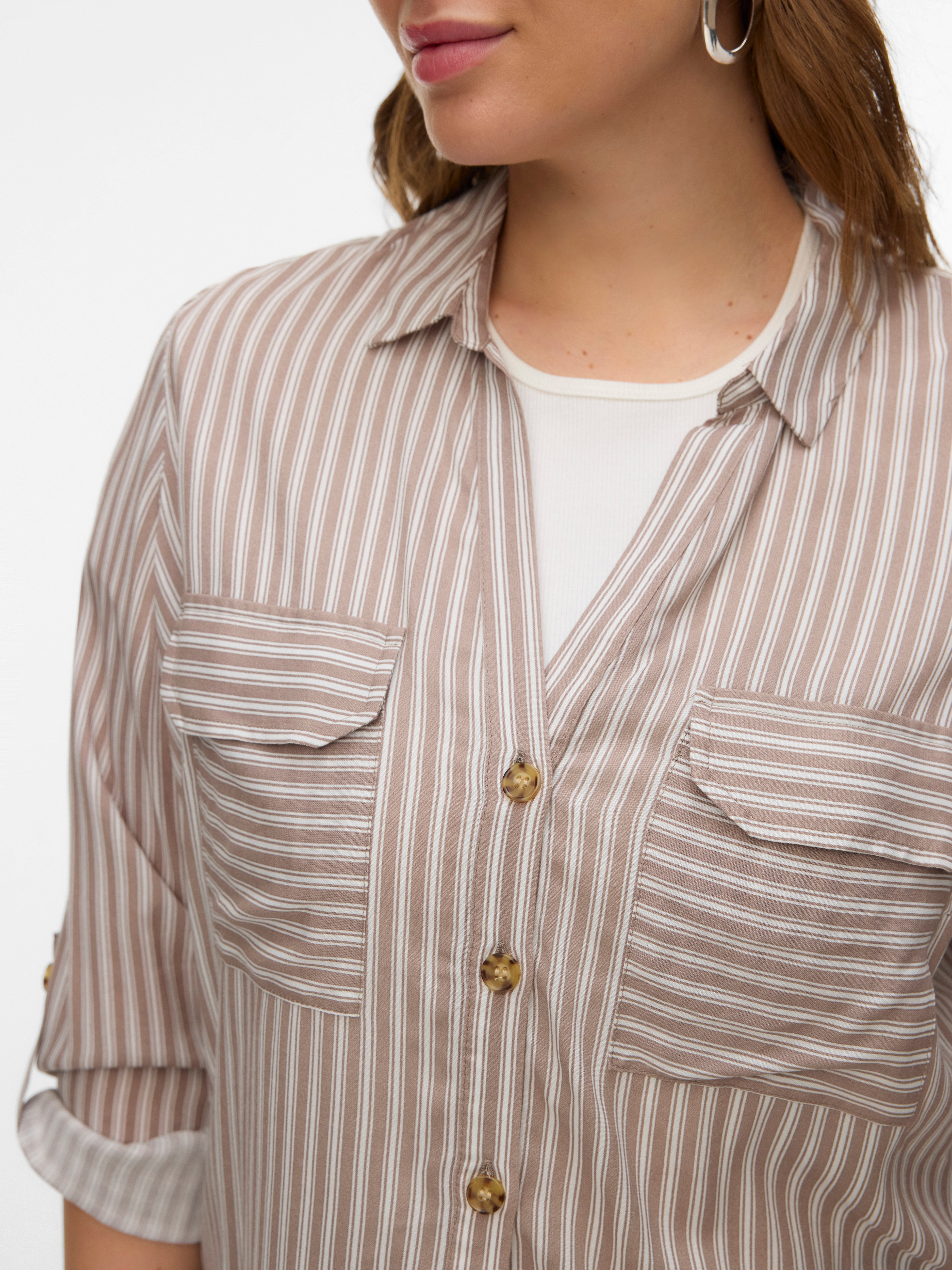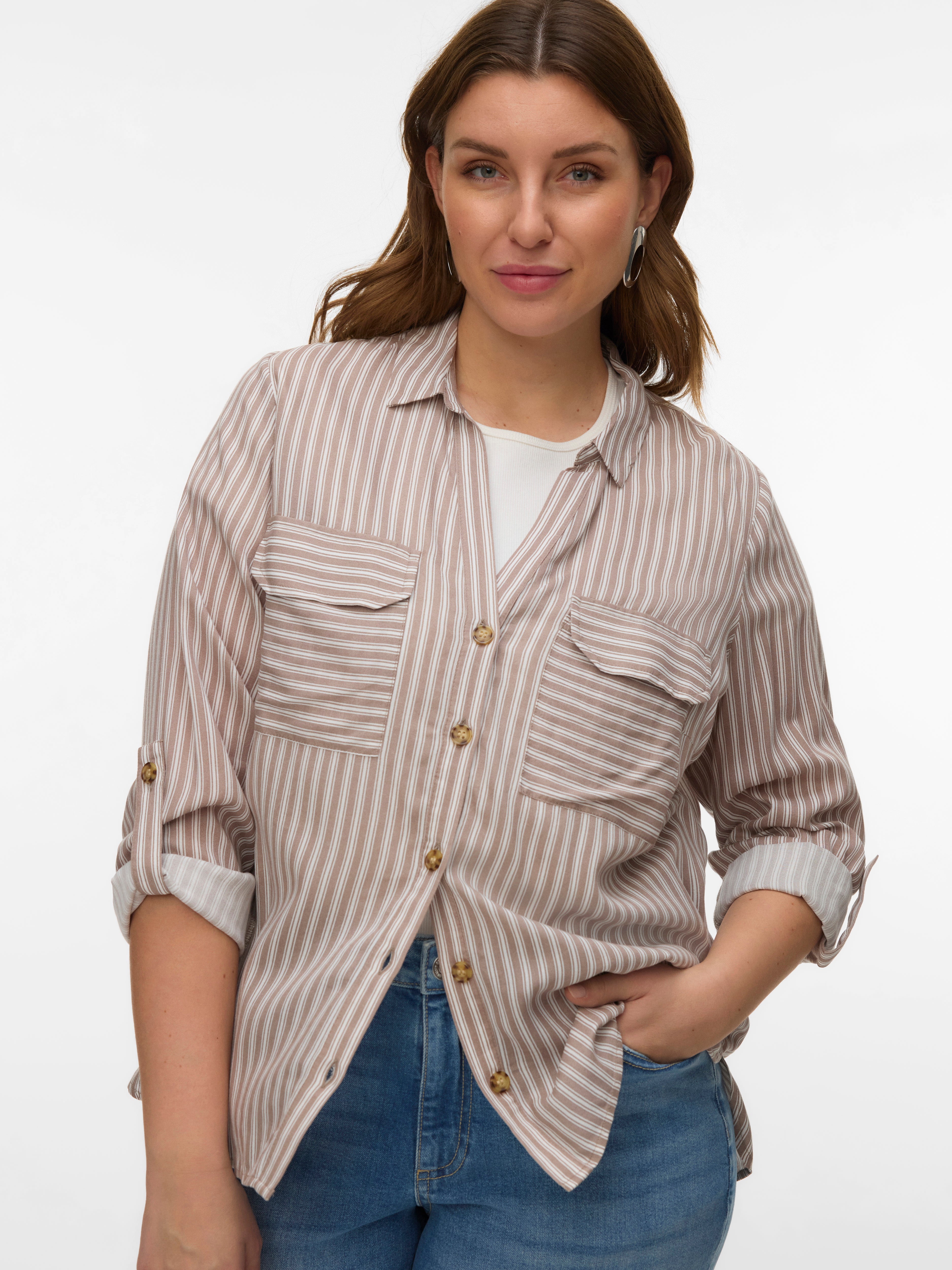 Deze casual gestreepte blouse van Vero Moda Curve heeft een overhemdkraag en een doorlopende knoopsluiting met bruine knopen. Het kledingstuk kenmerkt zich door verticale banen in taupe (Moon Rock) en wit (Eva Snow White). De voorzijde is voorzien van twee opgestikte borstzakken met kleppen. Deze overhemdbloes is ontworpen met lange mouwen, die je eenvoudig kunt oprollen en vastzetten. Een nuchter en comfortabel item dat past bij een optimistische levensstijl.