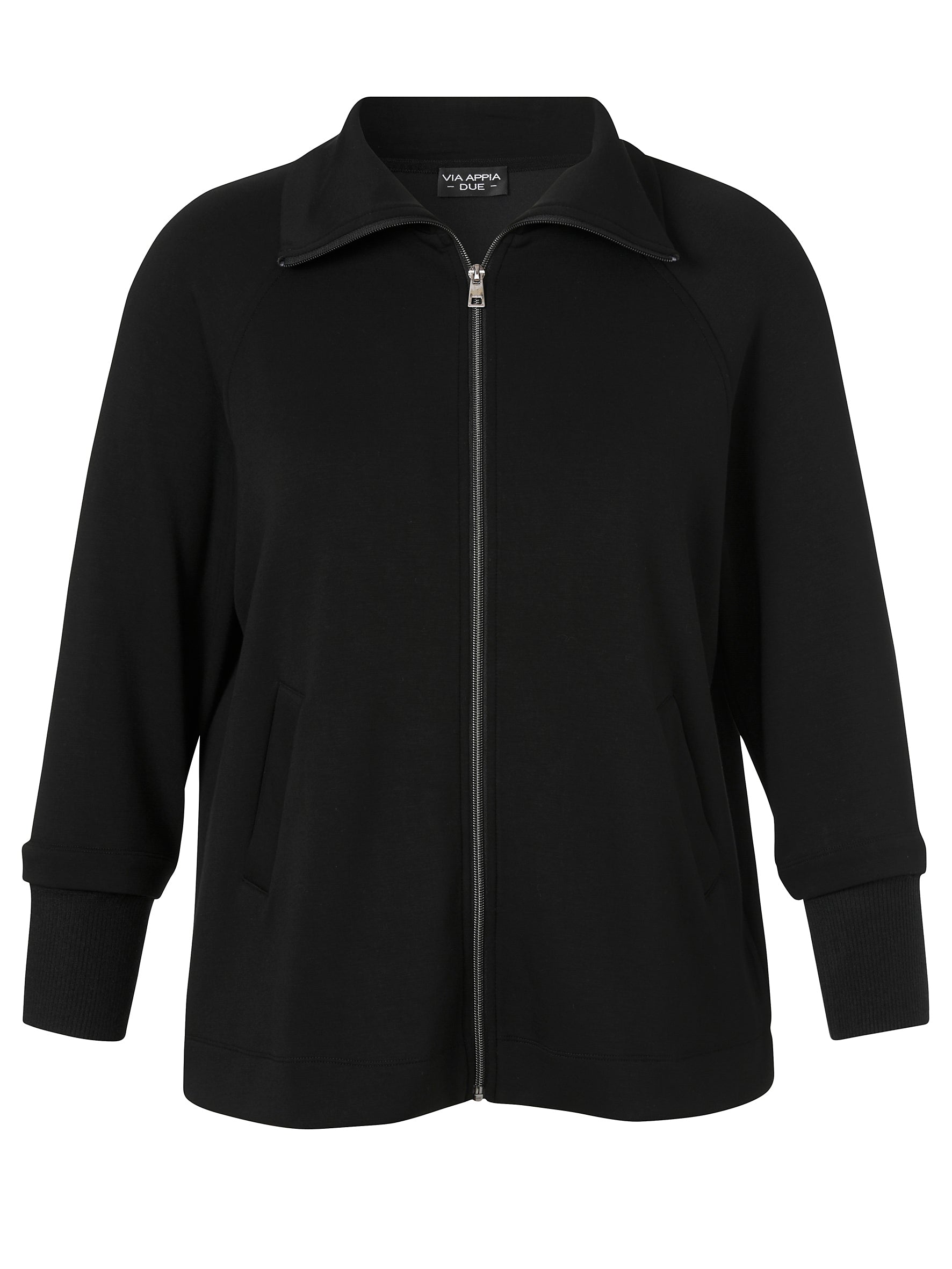 Dit zwarte sweatvest van Via Appia Due, model 2611714, is een comfortabel kledingstuk met een moderne uitstraling. Dit casual jack heeft een hoge, opstaande kraag en sluit met een zilverkleurige ritssluiting over de gehele lengte. Aan de voorzijde zijn twee functionele steekzakken aangebracht. De mouwen en de onderkant zijn afgewerkt met brede, gebreide ribboorden. Dit vest is een veelzijdige aanvulling op je garderobe en draagt licht en comfortabel.