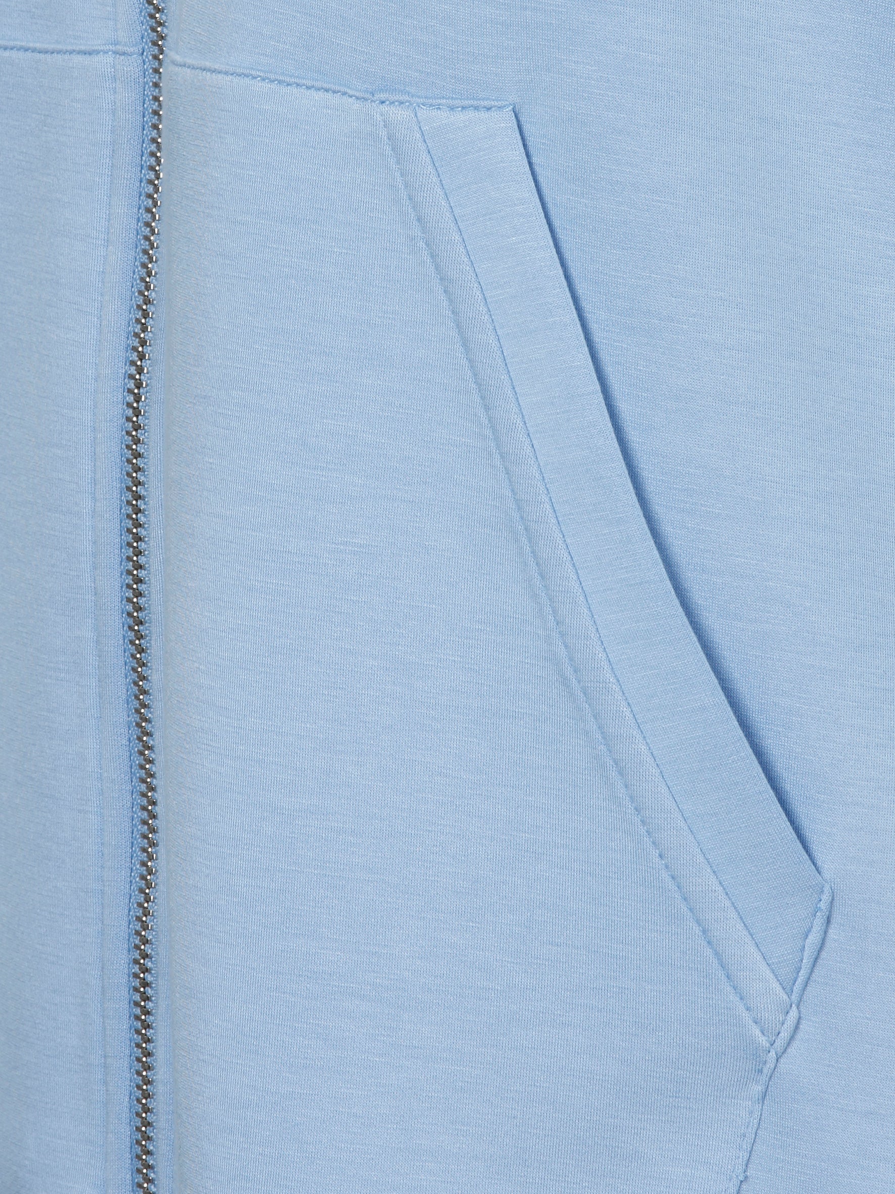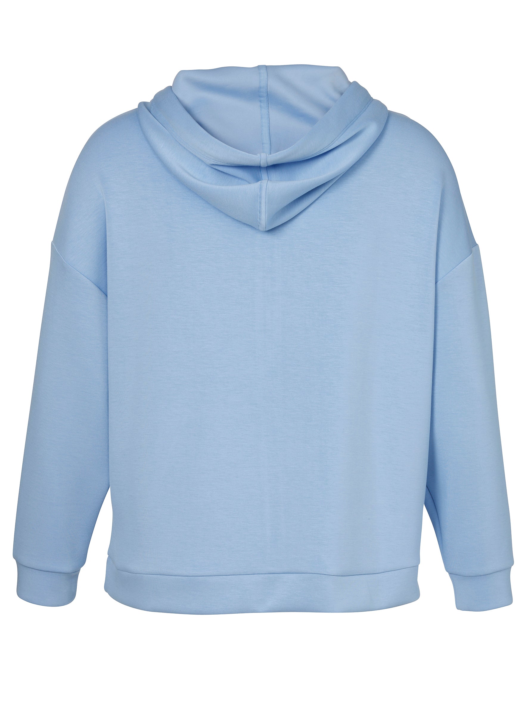 Dit lichtblauwe sweatvest van Via Appia Due is ontworpen als een comfortabele hoodie met lange mouwen. Het casual vest sluit middenvoor met een zilverkleurige ritssluiting. De capuchon is voorzien van trekkoorden met metalen afwerkingen. Aan de voorzijde vind je twee steekzakken, uitgevoerd als een praktische kangoeroezak. De afwerking bestaat uit brede ribgebreide boorden bij de zoom en mouwuiteinden, wat zorgt voor een fijne fit.Pasvorm en Stijladvies