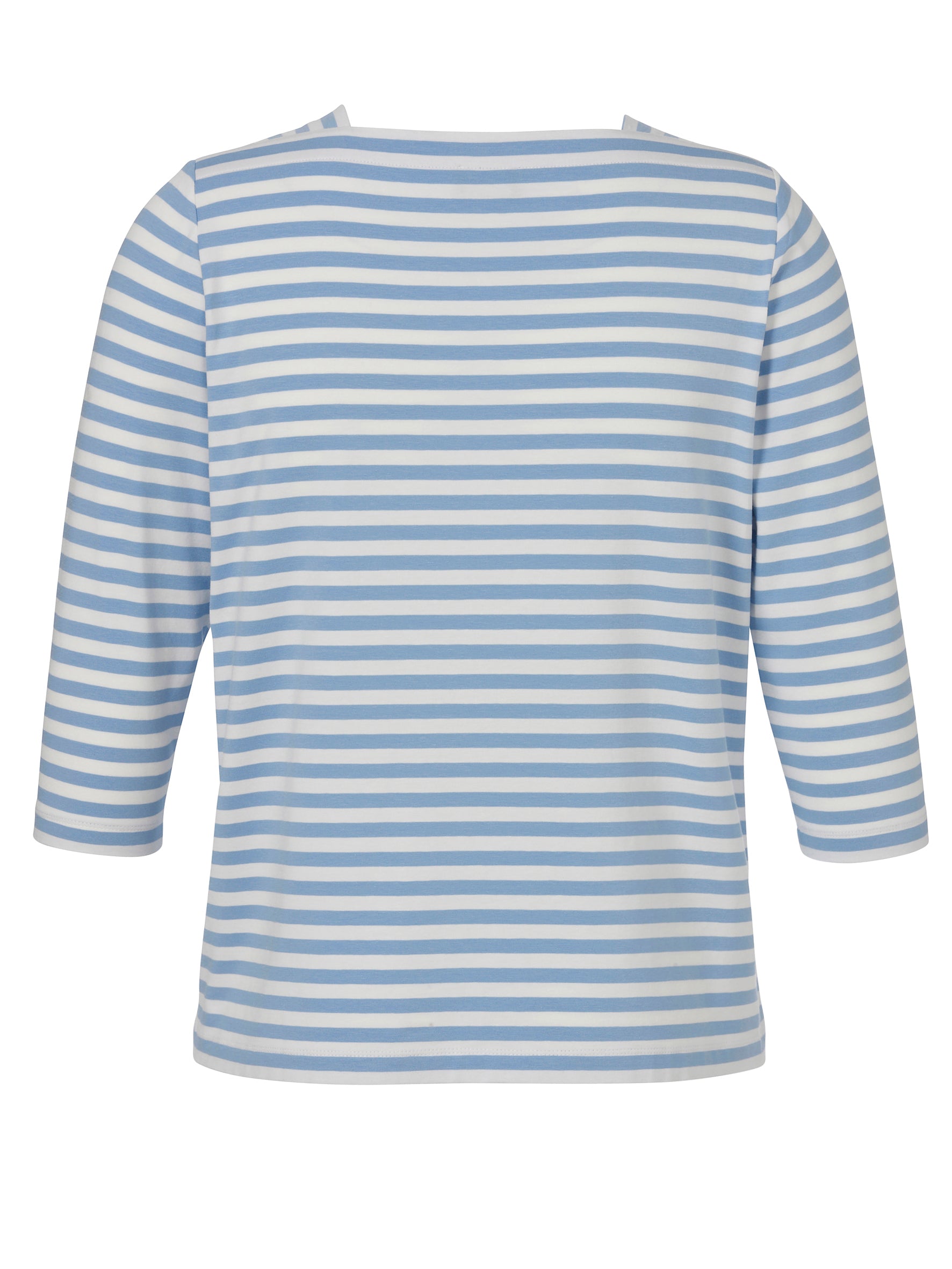 Dit Via Appia Due T-Shirt, uitgevoerd in hellblauwe en ecru strepen, is een modern bovenstuk. Het heeft een brede, platte boothals en driekwart mouwen. Het gestreepte dames shirt 2621410 is makkelijk te dragen voor een relaxte, casual look.