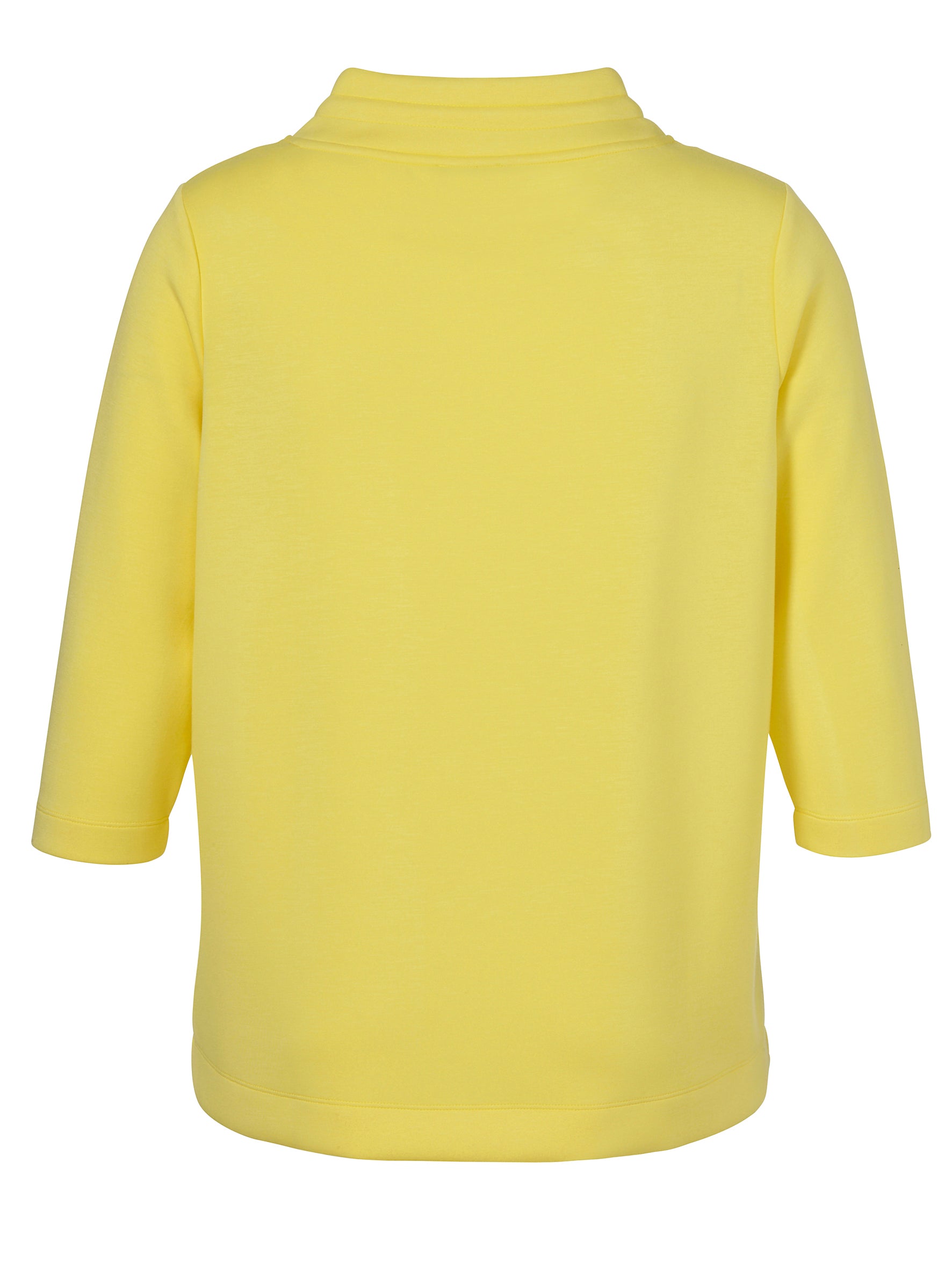 Deze Via Appia Due trui is uitgevoerd met driekwart mouwen en een casual, rechte pasvorm. De sweater heeft een opstaande halslijn voorzien van een tunnelkoord met zilverkleurige stoppers. De binnenrand van de kraag is afgewerkt met een ingezette zilverkleurige rij siersteentjes. Deze gele pullover is afgewerkt met een ribboord aan de onderzijde.Pasvorm en Stijladvies