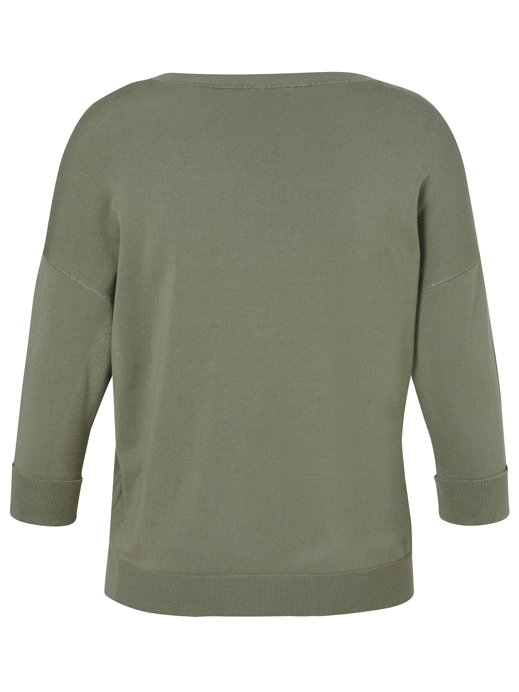 Deze moderne gebreide trui van Via Appia Due in de kleur salbei is uitgevoerd in een fijn breisel en voorzien van een wijde, ronde hals. De trui heeft een rechte pasvorm. De mouwen zijn omgeslagen tot een driekwart lengte en zijn vastgezet met een glanzende zilverkleurige drukknoop op de manchet. De onderkant, de manchetten en de halslijn zijn afgewerkt met een ribgebreide boord. Dit comfortabele breisel is een goede basis voor je casual kledingcollectie.