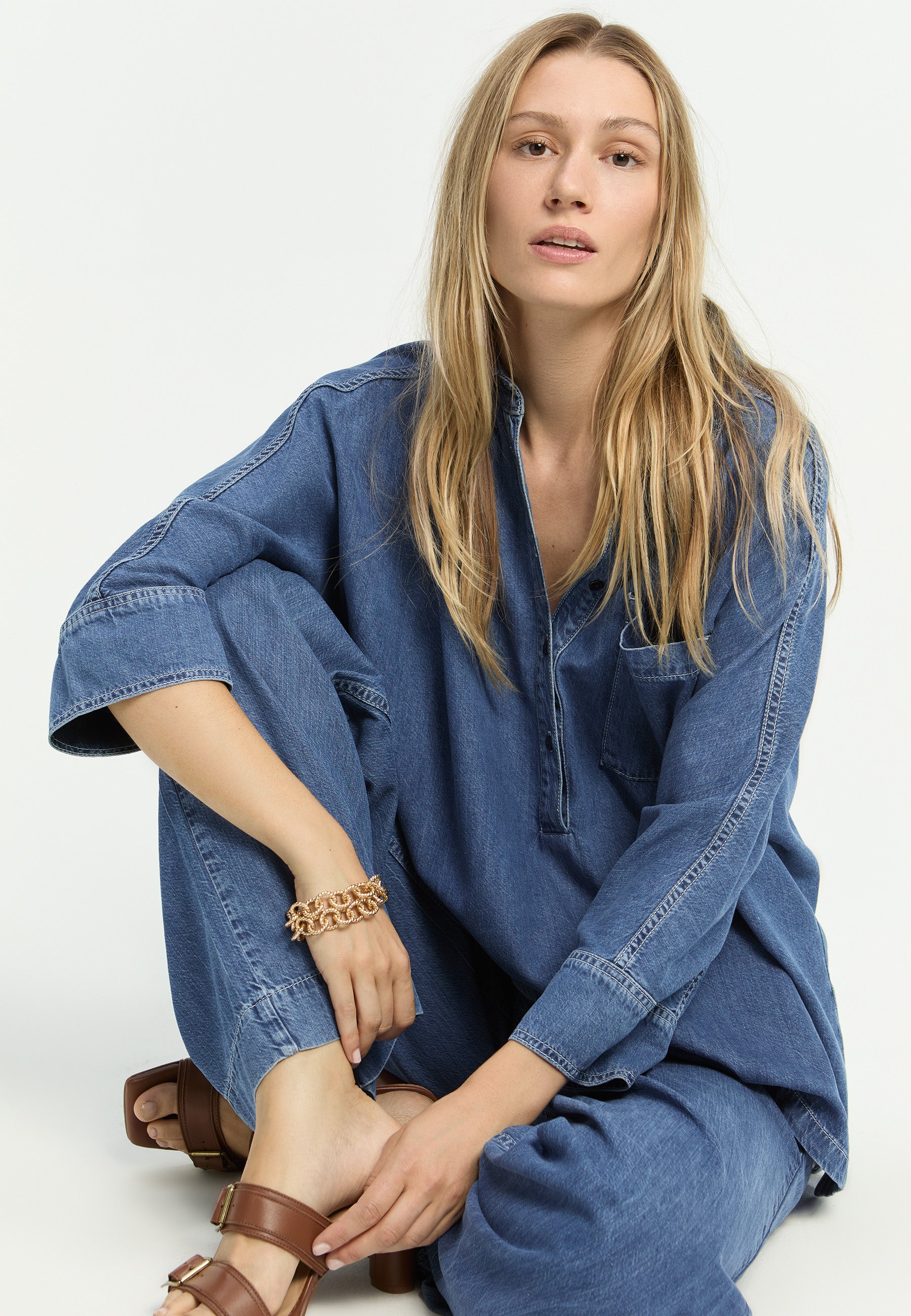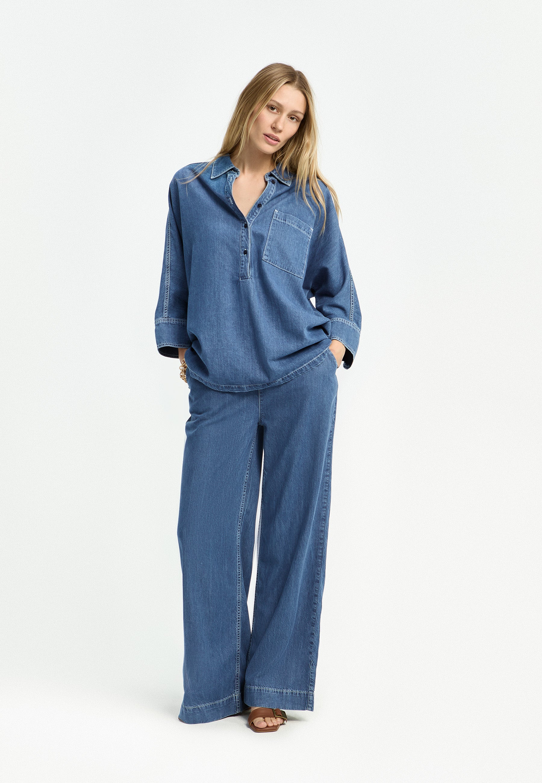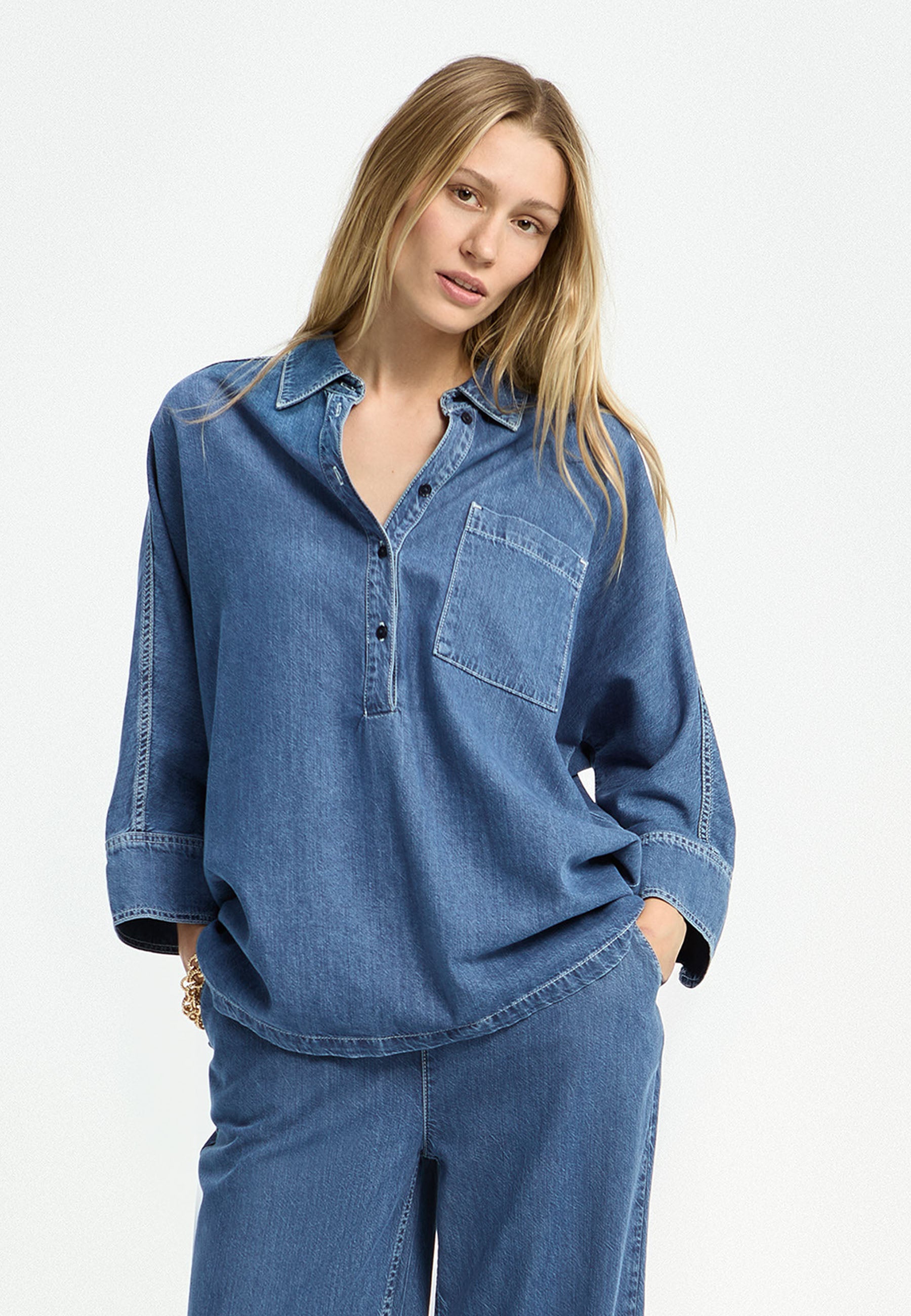 Door de royale pasvorm valt deze denim blouse van Xandres soepel om je lichaam. Je combineert dit model eenvoudig met een strakke, zwarte broek voor een gebalanceerde look. Voor een moderne, ton-sur-ton outfit kun je de pop-over blouse ook dragen op een bijpassende denim broek of wijde pantalon in dezelfde kleur blauw.Productkenmerken