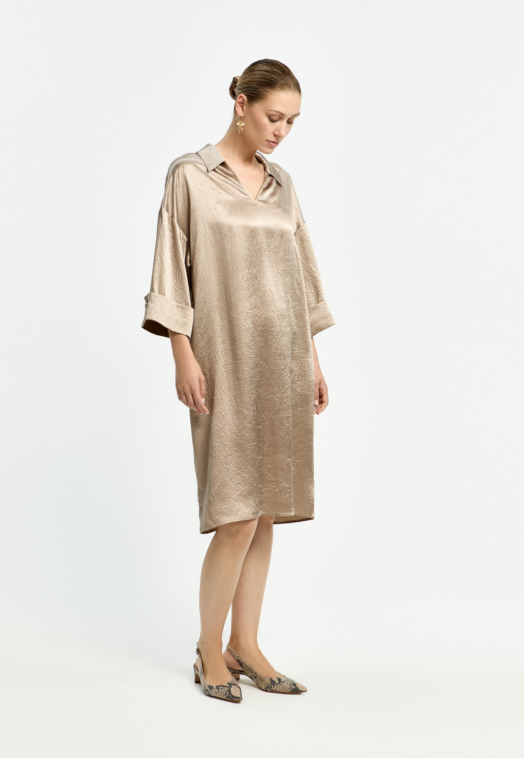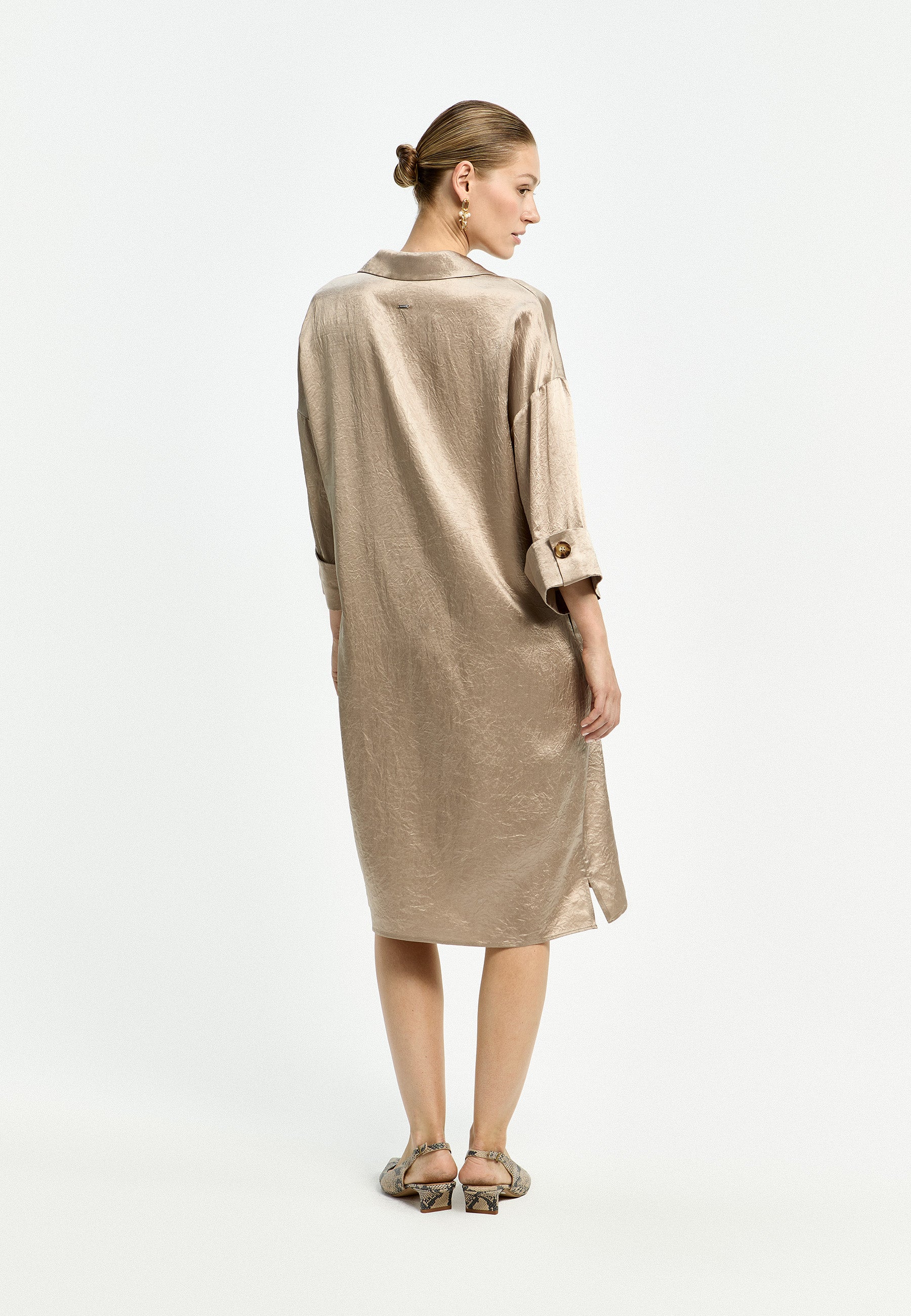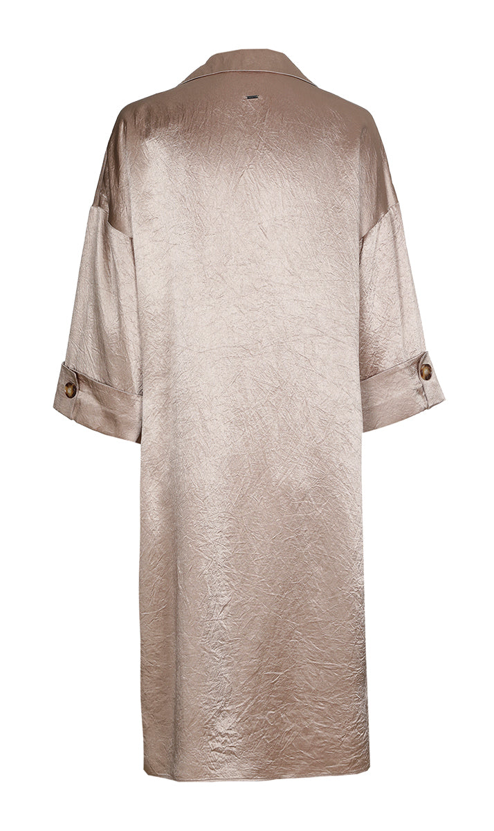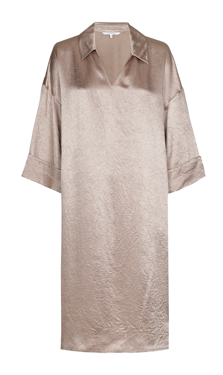 Deze tuniekjurk van Xandres is uitgevoerd in een glanzende stof met een fijne crinkle textuur. De lange jurk heeft een klassieke reverskraag met een V-hals. Dit model kenmerkt zich door de ruime, rechte pasvorm en de driekwarth mouwen met omgeslagen manchet. De manchet is vastgezet met een enkele bruine knoop. De lichte en soepele stof zorgt ervoor dat deze jurk comfortabel draagt voor je casual look.
