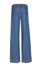 Deze Xandres pantalon, model 61539-01, heeft een soepele denim-achtige structuur in een lichte blauwe tint. De broek is voorzien van een elastische tailleband voor extra draagcomfort. De sluiting bestaat uit een verstelbaar trekkoord aan de voorzijde. Dit model heeft wijde pijpen en is op de achterzijde afgewerkt met twee opgestikte zakken, wat de pantalon een casual uitstraling geeft.