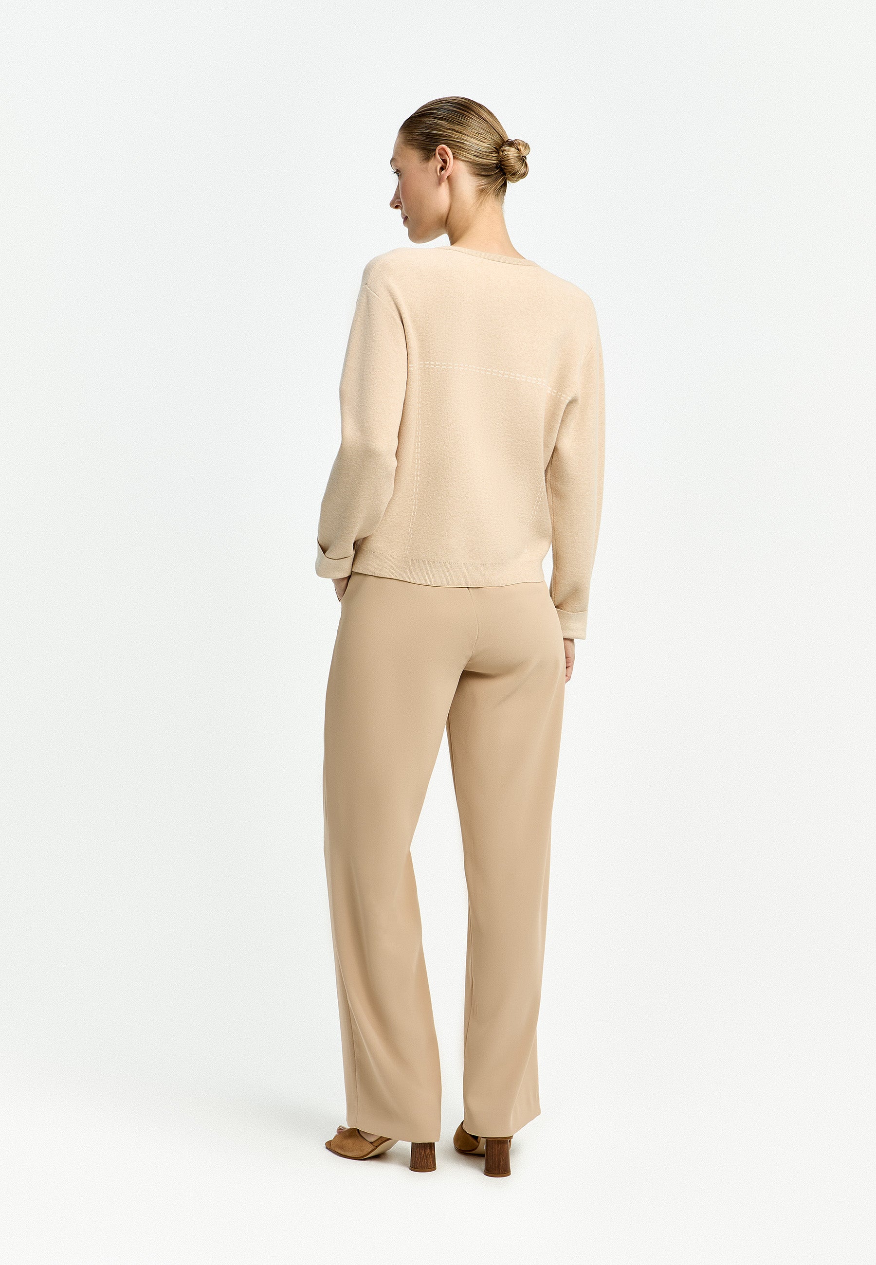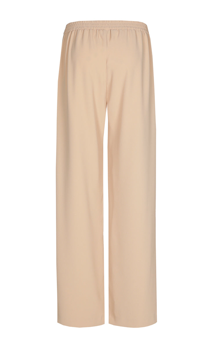 Deze Xandres pantalon in een neutrale beige tint heeft een strakke, moderne uitstraling. De broek met wijde pijpen is afgewerkt met een elastische tailleband aan de achterzijde, wat zorgt voor een comfortabele pasvorm. De voorzijde van de tailleband is glad en minimalistisch gehouden. Deze beige damesbroek is effen van dessin en heeft een lange lengte die de casual stijl van Xandres benadrukt.
