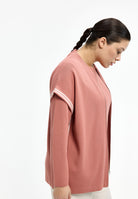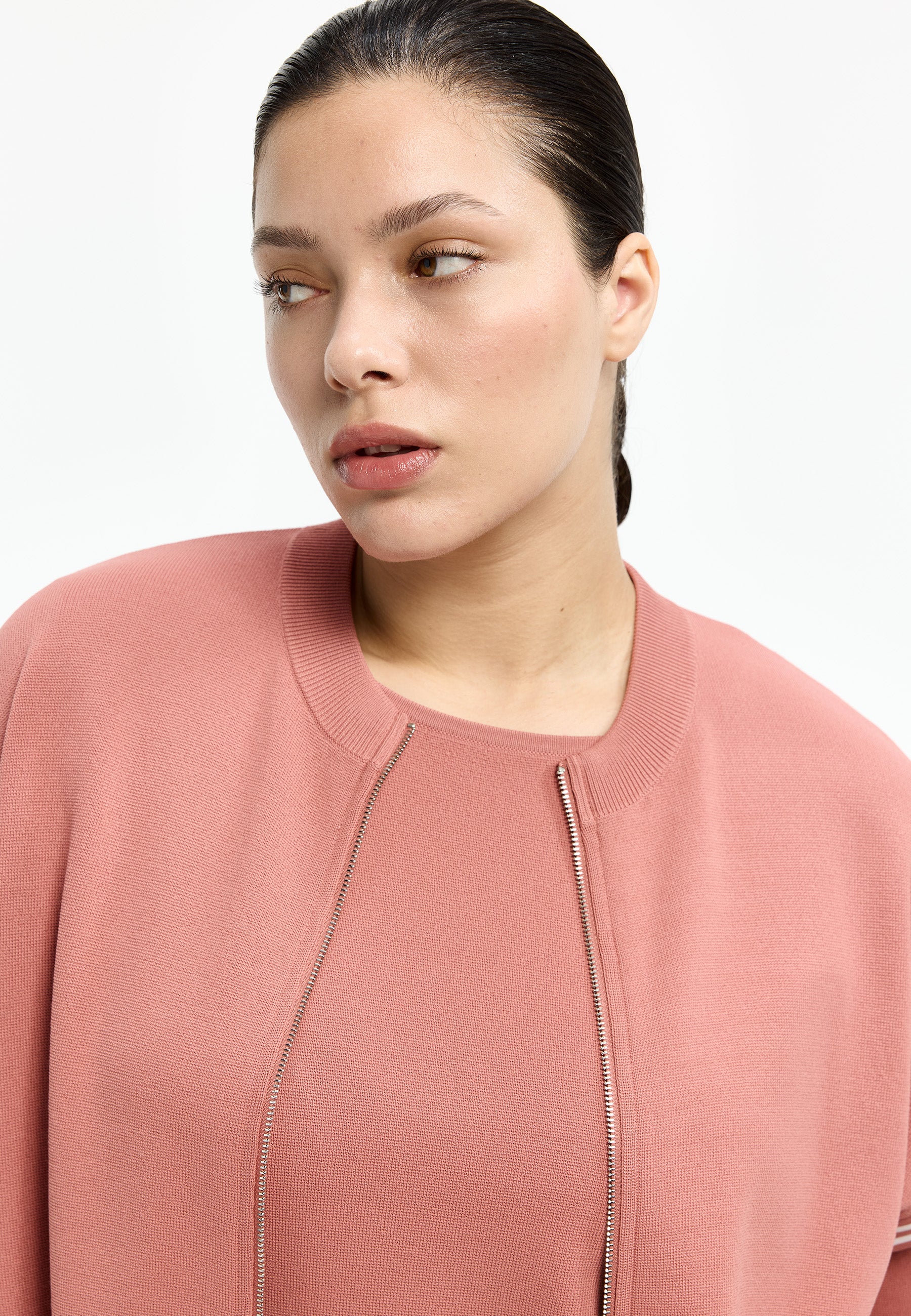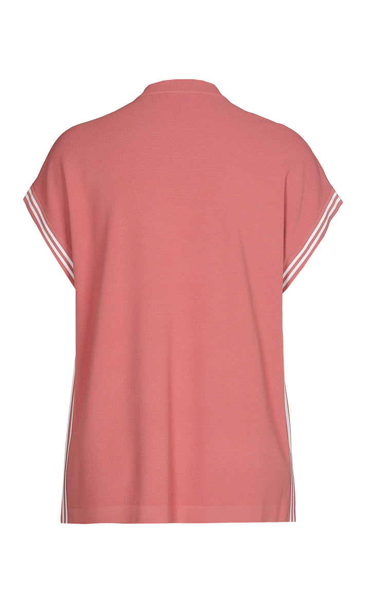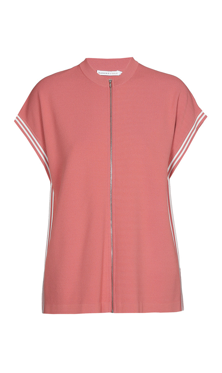 Dit gebreide Xandres vest is uitgevoerd in een koraalroze tricot. Het vest sluit met een zilverkleurige rits over de gehele lengte, wat zorgt voor een casual en toegankelijke look. Dit korte vest heeft een opstaande, ribgebreide kraag en korte mouwen met overgesneden schouders. Witte streepdetails op de mouwen en zijkanten geven dit kledingstuk een moderne, sportieve uitstraling.