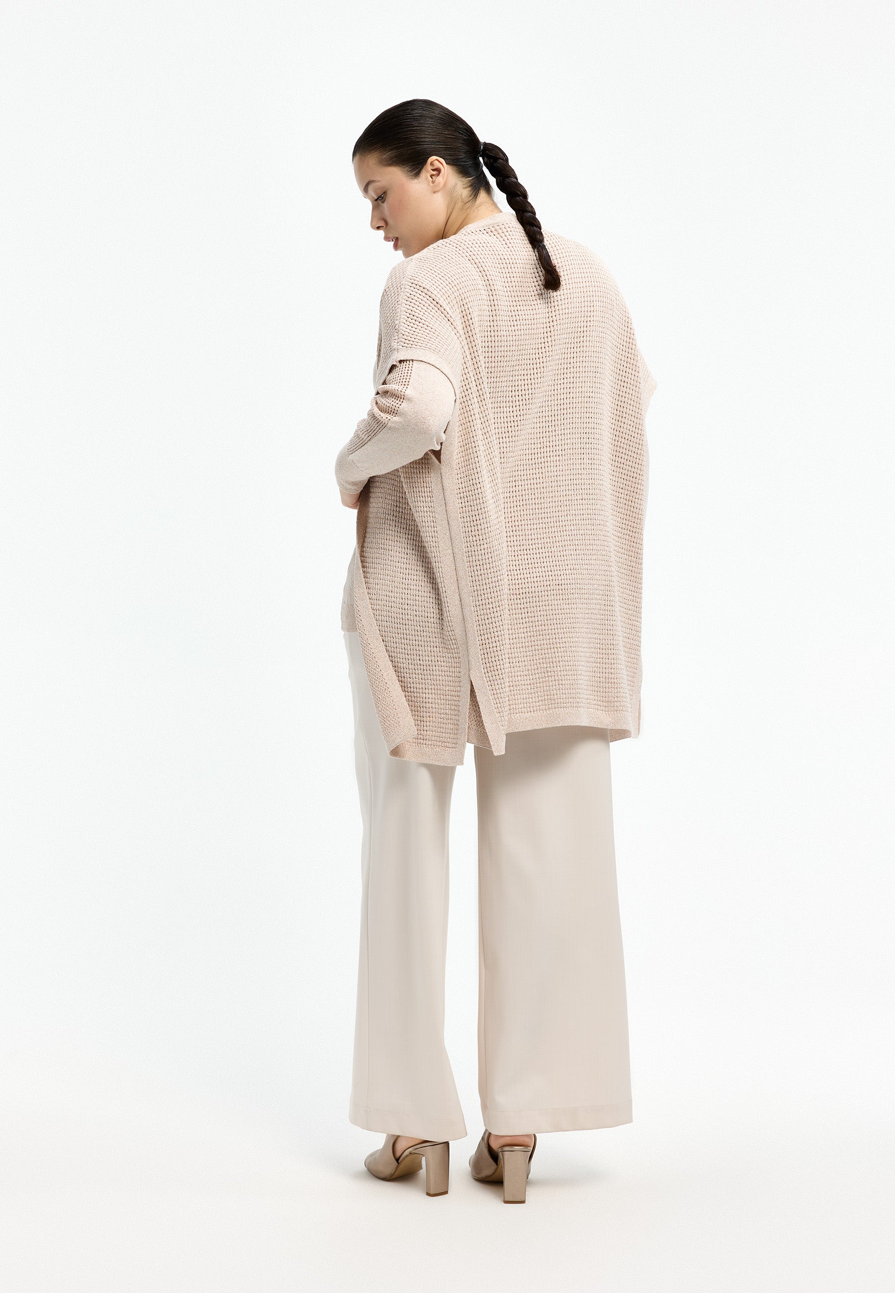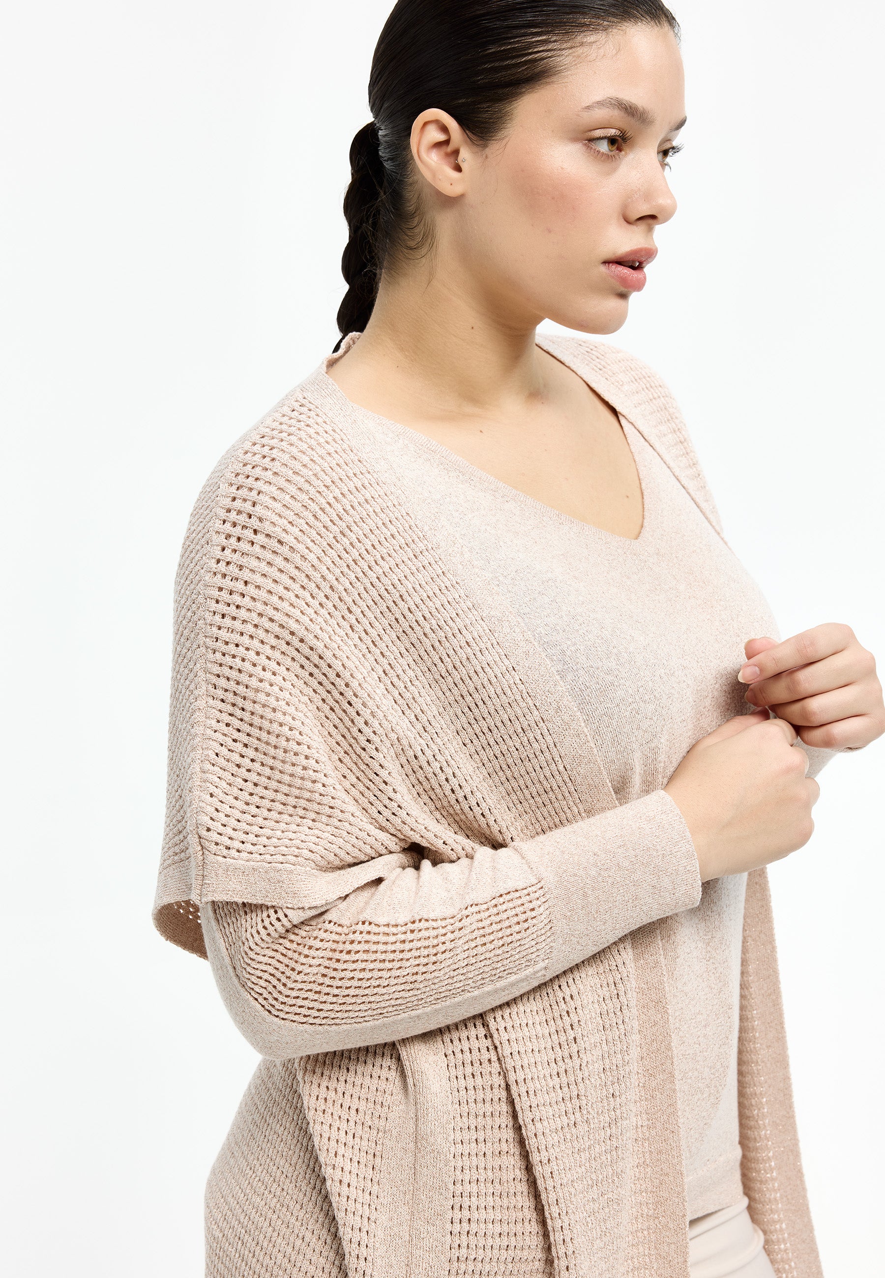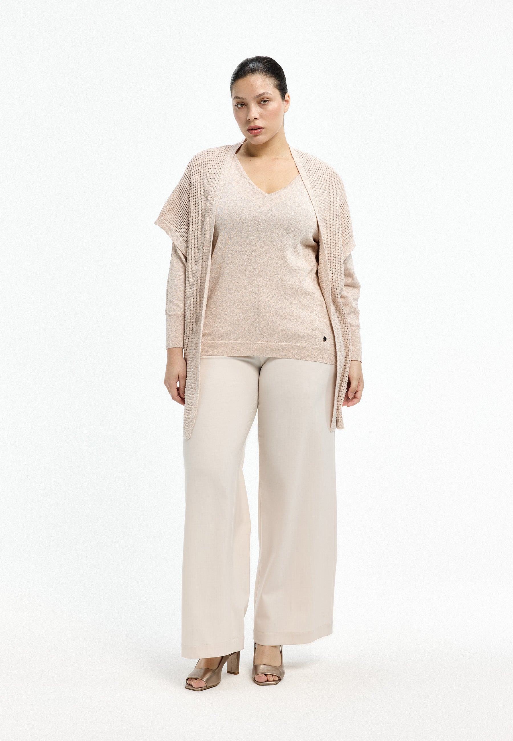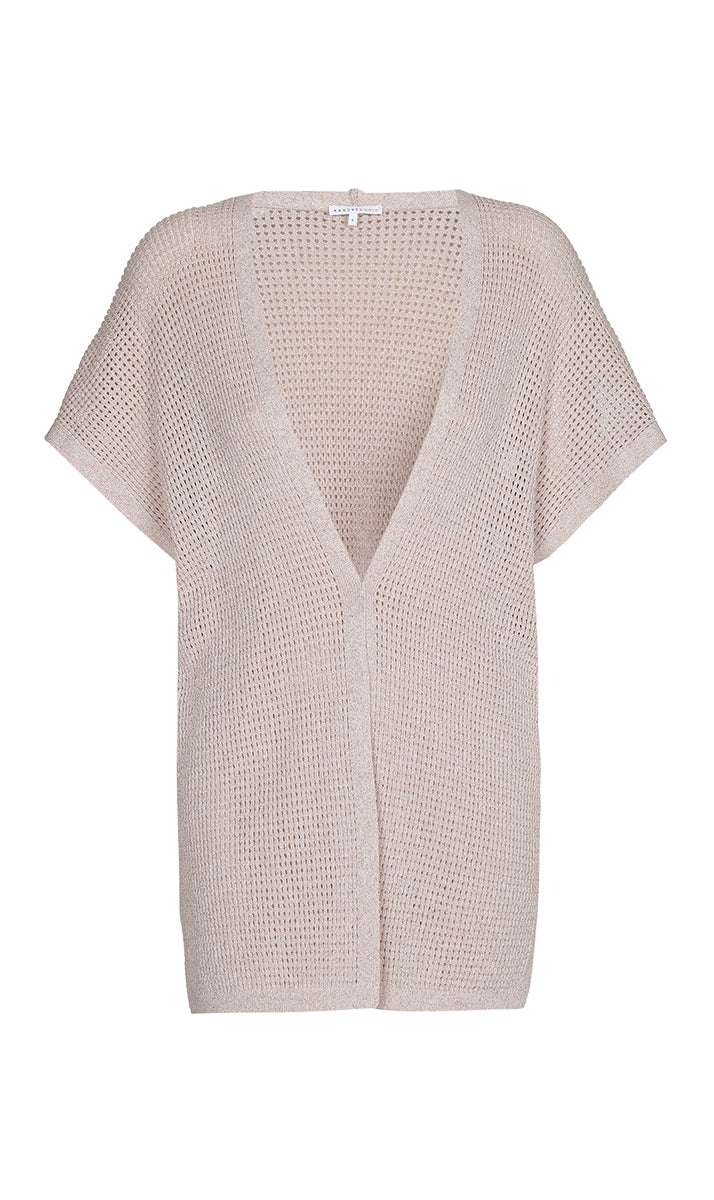 Dit gebreide damesvest, model 29523-01, van het merk Xandres kenmerkt zich door een open V-hals en korte mouwen. Het Xandres Vest 29523-01 Donkerroze is uitgevoerd in een fijne breistructuur. Dit vest heeft een deels opengewerkt dessin ter hoogte van de schouders en bovenzijde. De zoom en mouwuiteinden zijn afgewerkt met een dichtere brei-steek. De lengte van dit gebreide vest valt tot over de heupen, wat zorgt voor een recht silhouet.