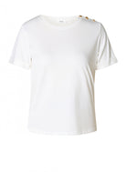 Dit is de Yest Curve Blouse A006250 Roomwit, een essentieel dames T-shirt met een casual uitstraling. Deze basis top van Yest Curve heeft een klassieke ronde hals en korte mouwen. De mouwen zijn afgewerkt met een vaste omslag. Op de linkerschouder zijn drie decoratieve, goudkleurige knopen aangebracht. Dit witte shirt is een makkelijk te combineren item voor je dagelijkse look.Pasvorm en Stijladvies