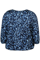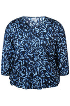 Deze Zhenzi blouse is uitgevoerd in een donkerblauwe basis met een all-over abstracte print in een lichtere blauwtint. Het kledingstuk heeft een V-halslijn met daaronder twee knopen als gedeeltelijke sluiting aan de voorzijde. De mouwen hebben een driekwart lengte en vallen wijd. Deze dames top heeft een elastische onderboord wat zorgt voor een blouson effect. De Zhenzi 201187 blouse is een casual item voor je garderobe.Pasvorm en Stijladvies