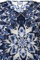 Deze Zhenzi blouse met een abstract dessin in marineblauw, wit en lila tinten is een veelzijdige toevoeging aan je garderobe. Dit dames shirt met V-hals heeft driekwart mouwen die zijn afgewerkt met elastische boorden. De Zhenzi Blouse 201201 is ontworpen voor een casual look en heeft een elastische zoom aan de onderzijde, wat zorgt voor een aansluitende pasvorm. Dit kledingstuk is onderdeel van de Zhenzi collectie voor grote maten.Pasvorm en Stijladvies