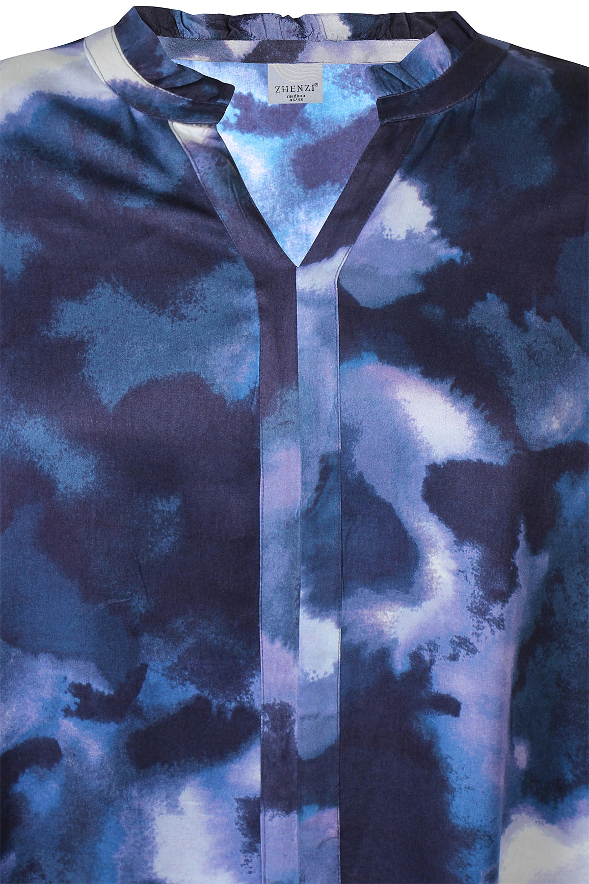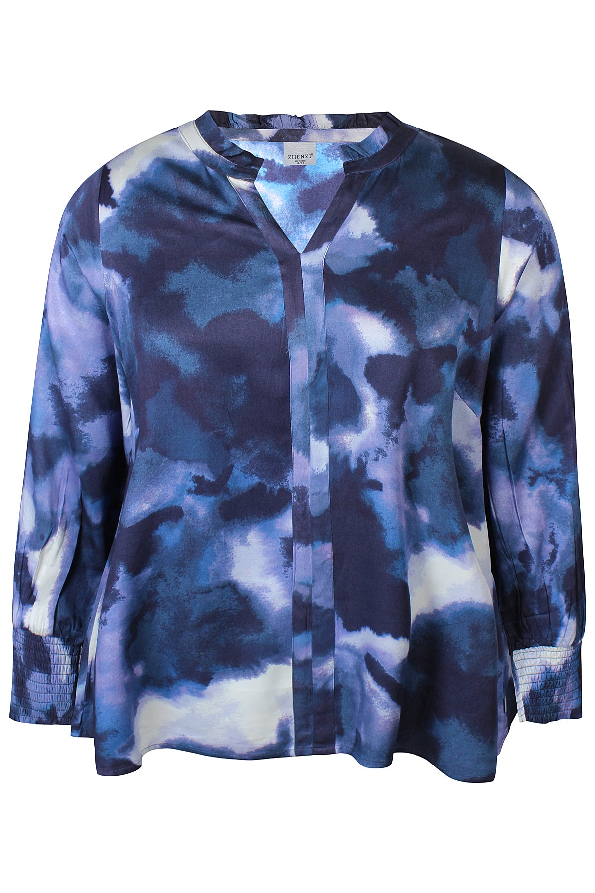 Deze Zhenzi damesblouse is uitgevoerd in een marineblauwe aquarel print met verschillende nuances blauw, paars en wit. De blouse heeft een opstaande bandkraag die overgaat in een open V-hals. Een bedekte knoopsluiting loopt centraal over de borst. De lange mouwen van deze Zhenzi Blouse 201203 Marineblauw zijn afgewerkt met gesmockte, elastische manchetten, wat zorgt voor een comfortabele afwerking. Dit item heeft een ruimvallende pasvorm.