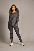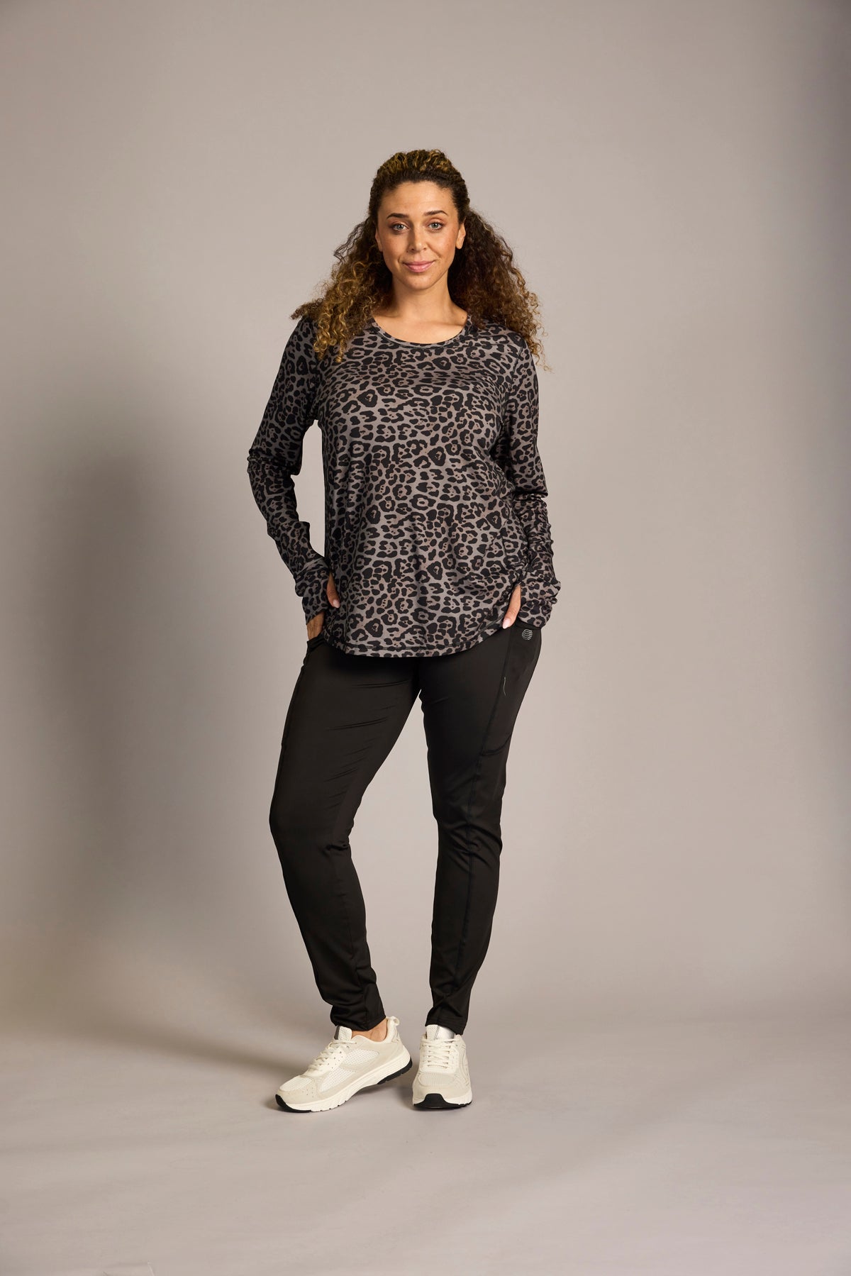 Dit Zhenzi T-Shirt 201223 Zwart is een casual bovenstuk met een all-over luipaarddessin in zwart en grijs. Het longsleeve T-shirt heeft een wijde, ronde halslijn en lange mouwen. De ruime pasvorm is ontworpen voor draagcomfort, wat perfect past bij een ontspannen, casual stijl.