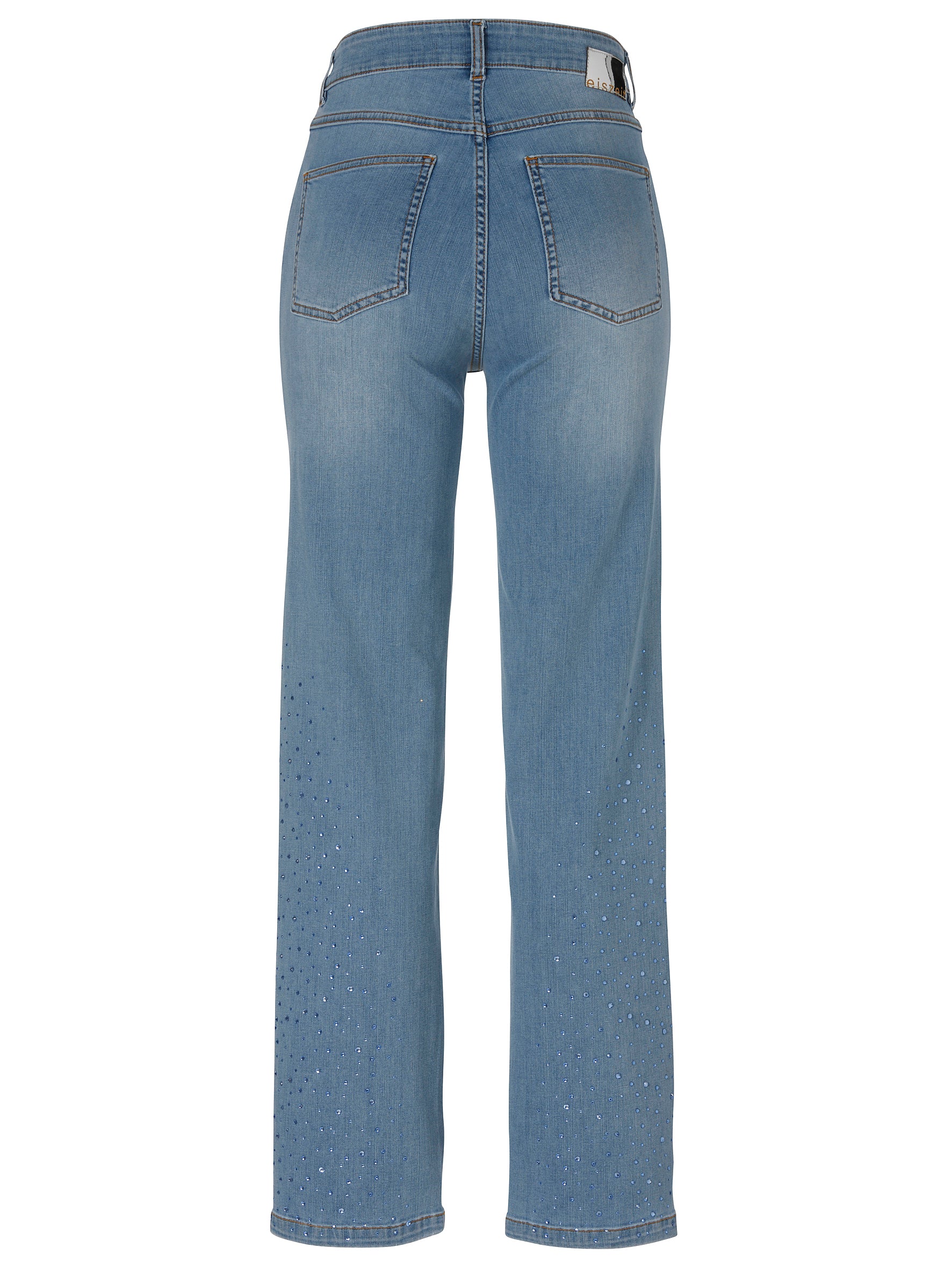 De Eiszeit Broek 2671604 is een klassiek vijfzakkenmodel uitgevoerd in mid blue denim. Deze spijkerbroek heeft een rechte pasvorm en sluit met een rits en knoop. De broek beschikt over riemlussen in de tailleband. Op de onderbenen zijn opvallende blauwe strass-steentjes aangebracht, wat zorgt voor een uniek design. Deze denim broek van het merk Eiszeit is geschikt voor jouw dagelijkse, casual kledingstijl.