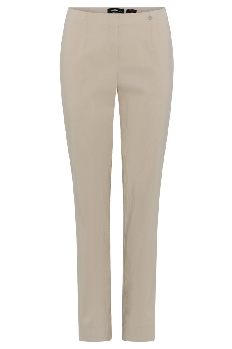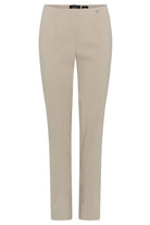 Deze Godske Group dames pantalon, de Robell Broek 1-51412-5499-0, heeft een minimalistisch ontwerp. De broek in een lichte zandkleur wordt gekenmerkt door een gladde tailleband en slanke, rechte pijpen. Er is een subtiel metallic detail zichtbaar op de tailleband aan de rechterzijde. Dit ontwerp van Robell zorgt voor een nette afwerking en een strakke look, perfect voor een casual en moderne levensstijl.