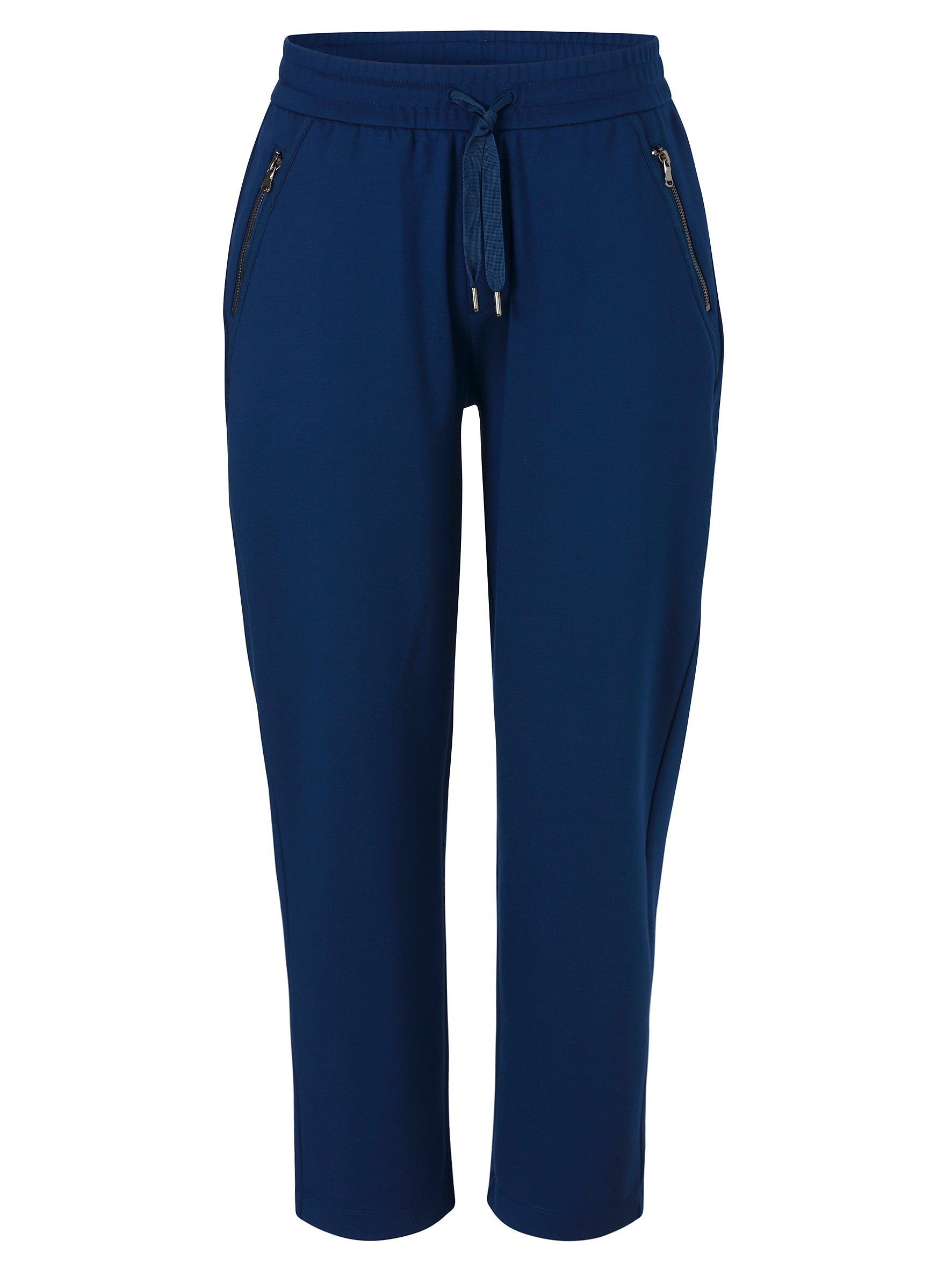 Deze sportieve damesbroek van Via Appia Due is uitgevoerd in een diepblauwe kleur. De casual broek heeft een comfortabele elastische tailleband die verstelbaar is met een trekkoord. Aan de voorzijde bevinden zich twee schuine steekzakken, beide afgesloten met een metaalkleurige ritssluiting. Deze broek, vaak gedragen als een 7/8 model, heeft een rechte pijp en is ideaal voor jouw ontspannen momenten.