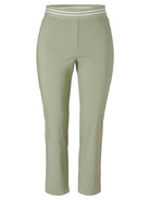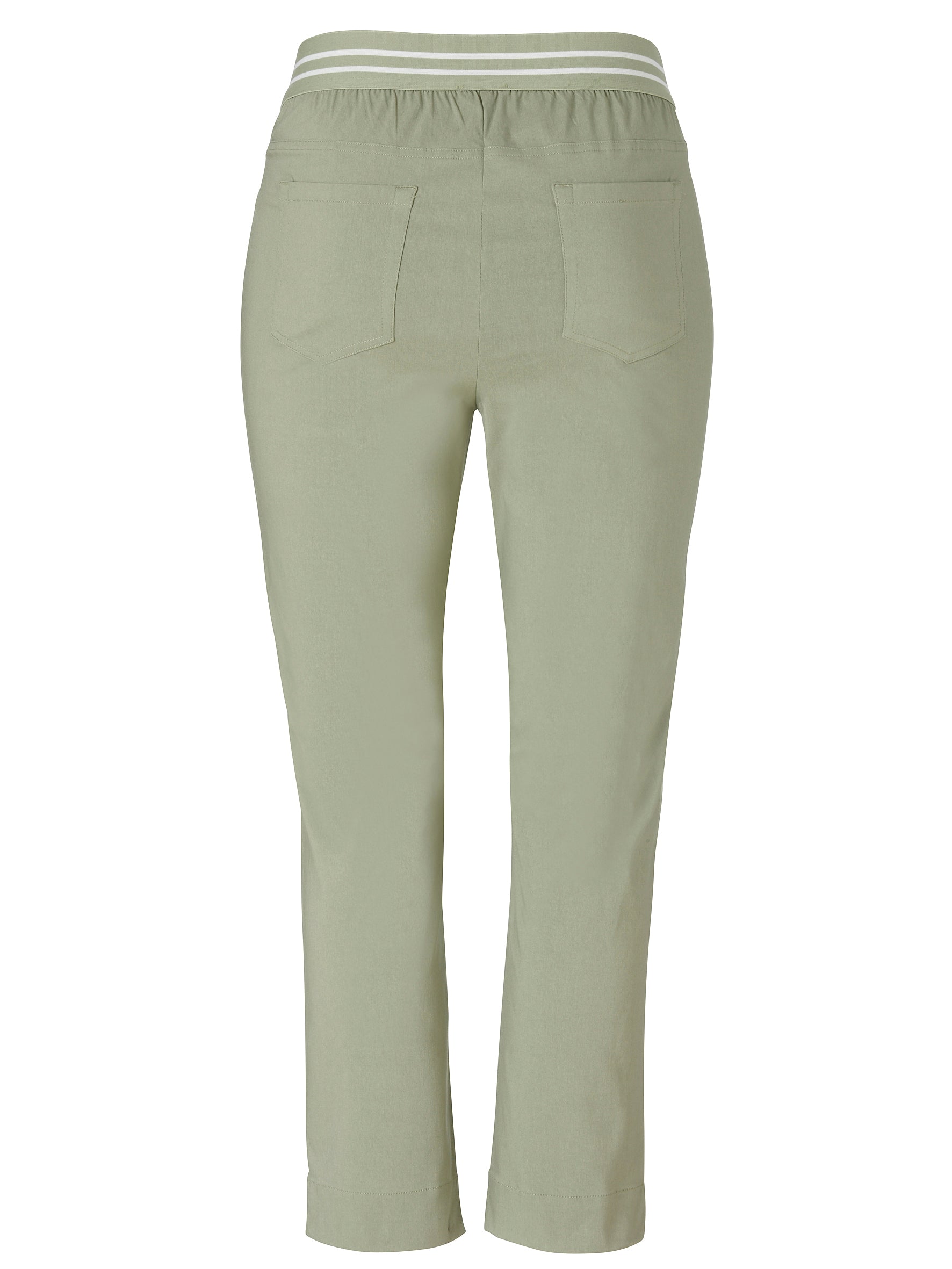 De Via Appia Due dames broek 2611988 in salbei en ecru is een casual pantalon met een moderne uitstraling. Deze lange broek is voorzien van een gedeeltelijke elastische tailleband met een gestreept dessin aan de bovenzijde. De voorkant sluit met een kleine rits en haaksluiting. Je ziet twee schuine steekzakken aan de voorzijde en twee opgestikte zakken aan de achterkant. De rechte pijpen hebben een 7/8 lengte en zijn perfect voor je dagelijkse look.Pasvorm en Stijladvies