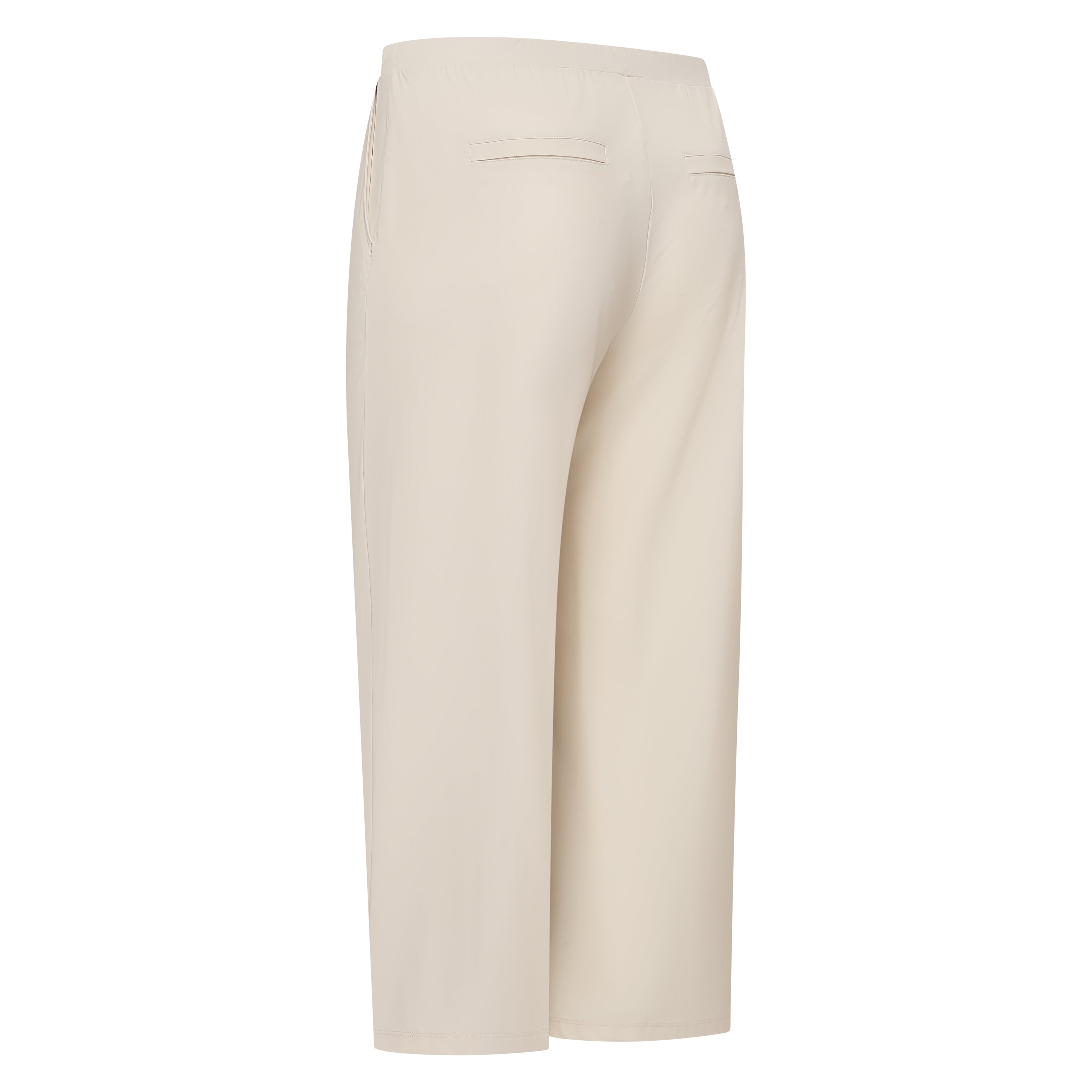 Deze PlusBasics broek, model 10 261 283, is uitgevoerd in een lichte roomwitte kleur. De comfortabele wijde pantalon is gemaakt van een glad geweven stof en kenmerkt zich door de elastische tailleband. De damesbroek is aan de voorzijde voorzien van twee steekzakken en heeft aan de achterkant twee paspelzakken. De moderne, kortere lengte draagt bij aan een casual en open uitstraling.Pasvorm en Stijladvies