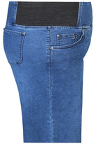 Deze Zhenzi Blauwe Jeans 201414 is een pull-on spijkerbroek met een hoge taille en brede zwarte elastische tailleband. De denim broek heeft twee imitatiezakken aan de voorzijde, voorzien van metalen klinknagels, en twee opgestikte zakken aan de achterzijde. De tailleband aan de achterkant is voorzien van het geborduurde woord 'WEJEANS'. Dit model is afgewerkt met een licht gebleekte wassing op de bovenbenen.Pasvorm en Stijladvies