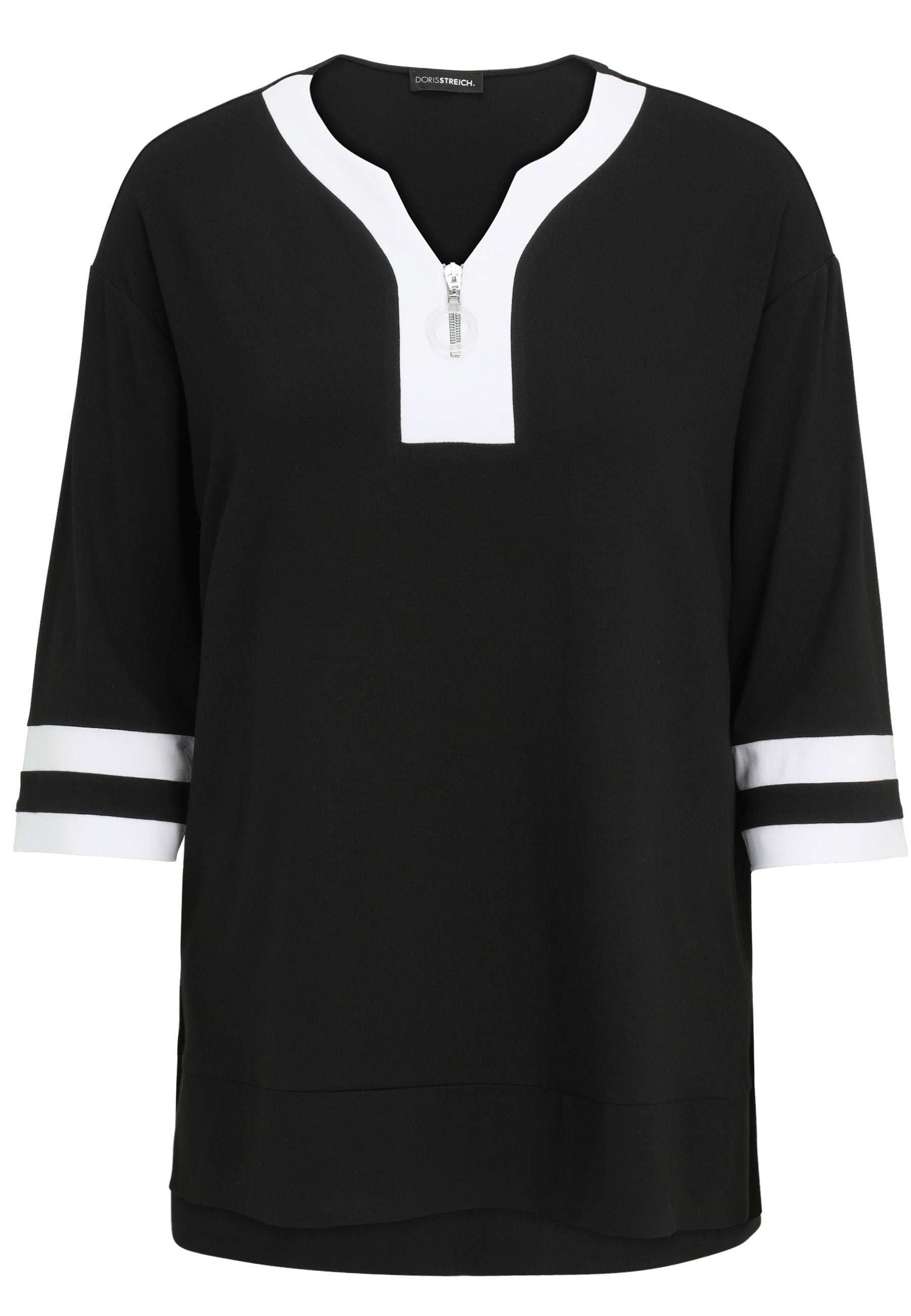 De Doris Streich tuniek in zwart en wit heeft een casual uitstraling door de royale pasvorm. Deze moderne tuniek heeft een V-hals, geaccentueerd met een brede witte bies. Een korte zilverkleurige ritssluiting is verwerkt in de bies. De driekwarthoge mouwen zijn afgewerkt met een witte boord en dubbele streepdetails, wat zorgt voor een sportieve look.