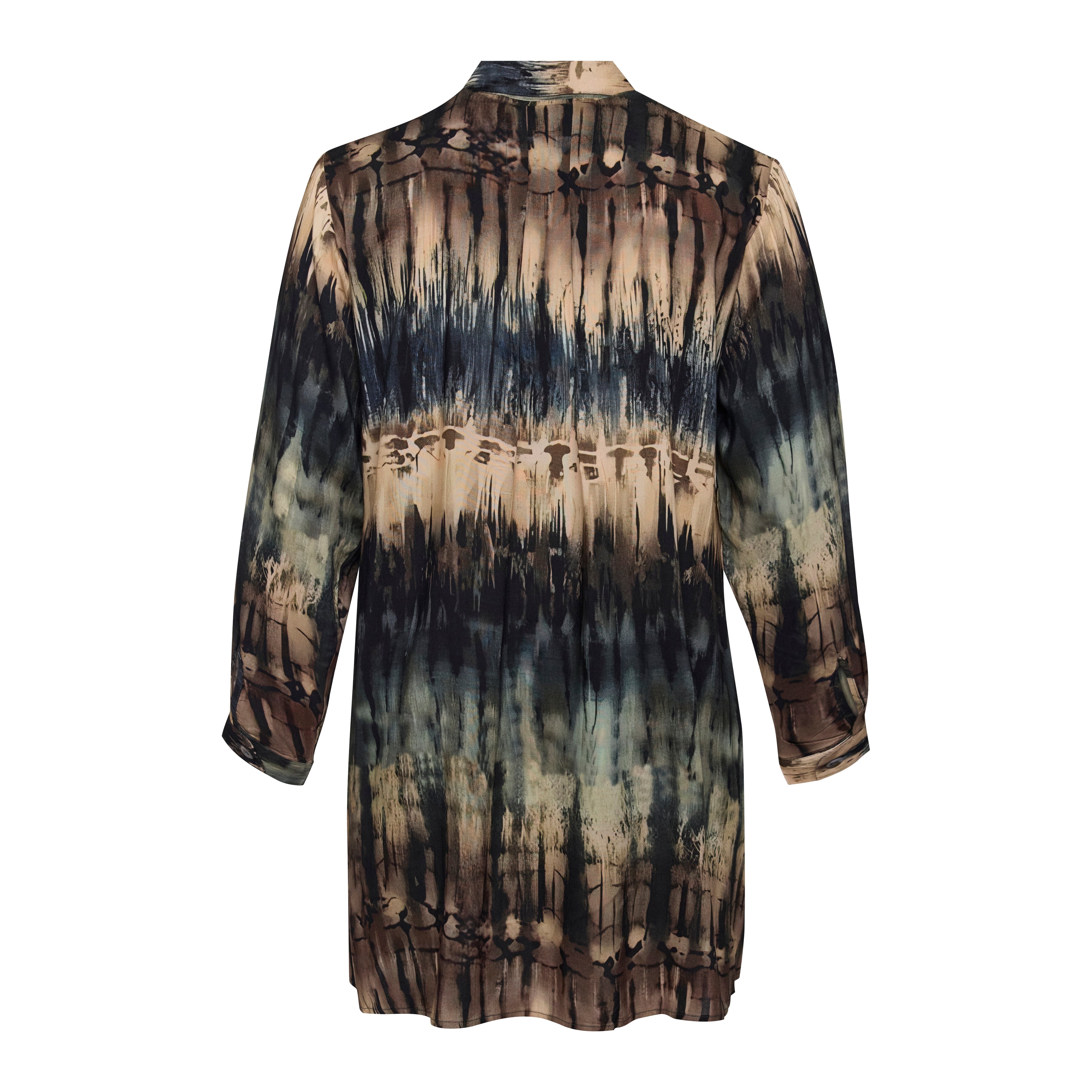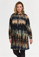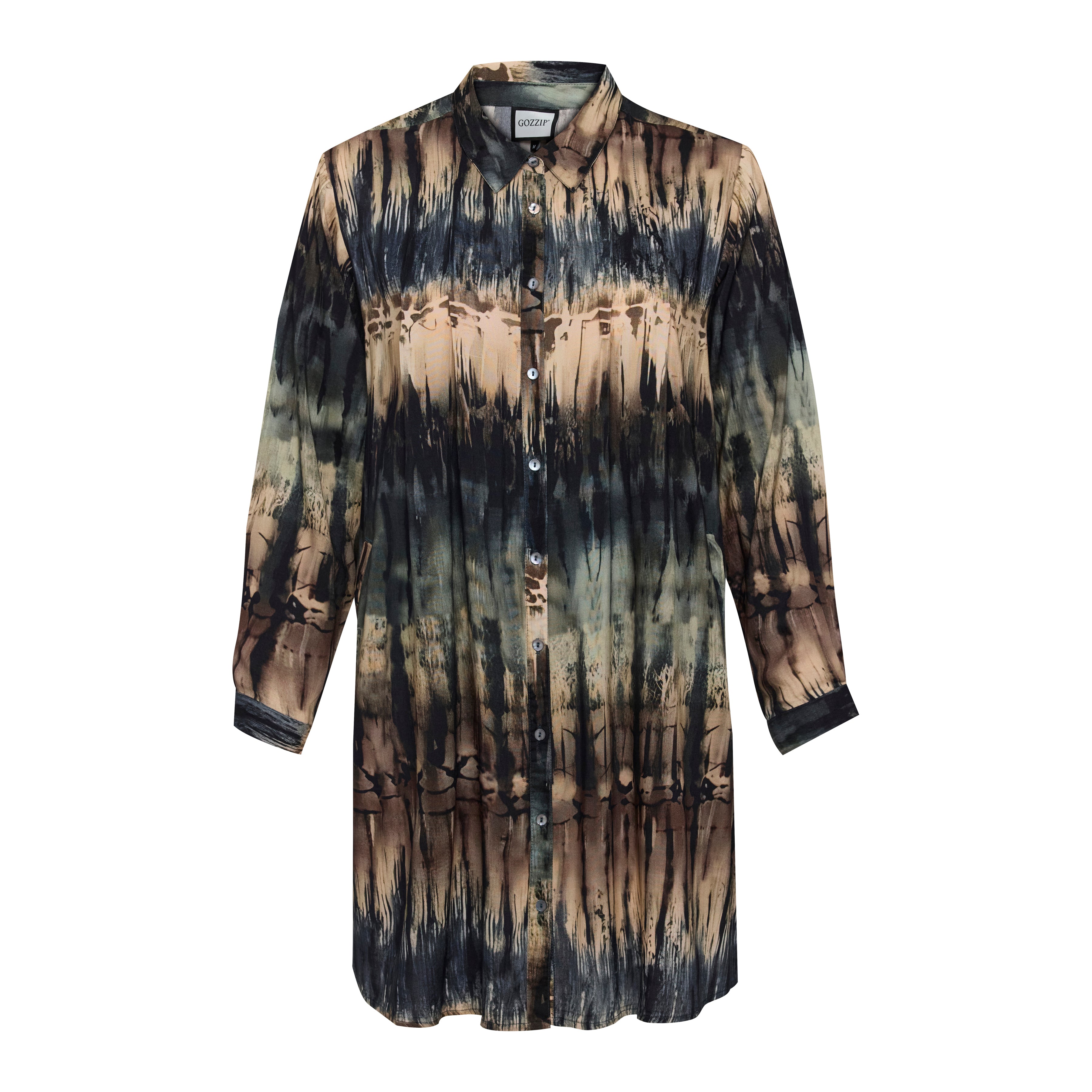 De Gozzip lange blouse, ook wel bekend als de G261039 tuniek, heeft een all-over abstract patroon met verticale kleurovergangen in multi-tinten. Dit tuniekmodel van het merk Gozzip is uitgevoerd met een klassieke blousekraag en lange mouwen met manchetten voorzien van een knoopsluiting. Aan de voorzijde loopt een doorlopende knoopsluiting met ton-sur-ton knopen. De rechte pasvorm en de langere lengte zorgen voor een casual uitstraling die bijdraagt aan een optimistische en open look.