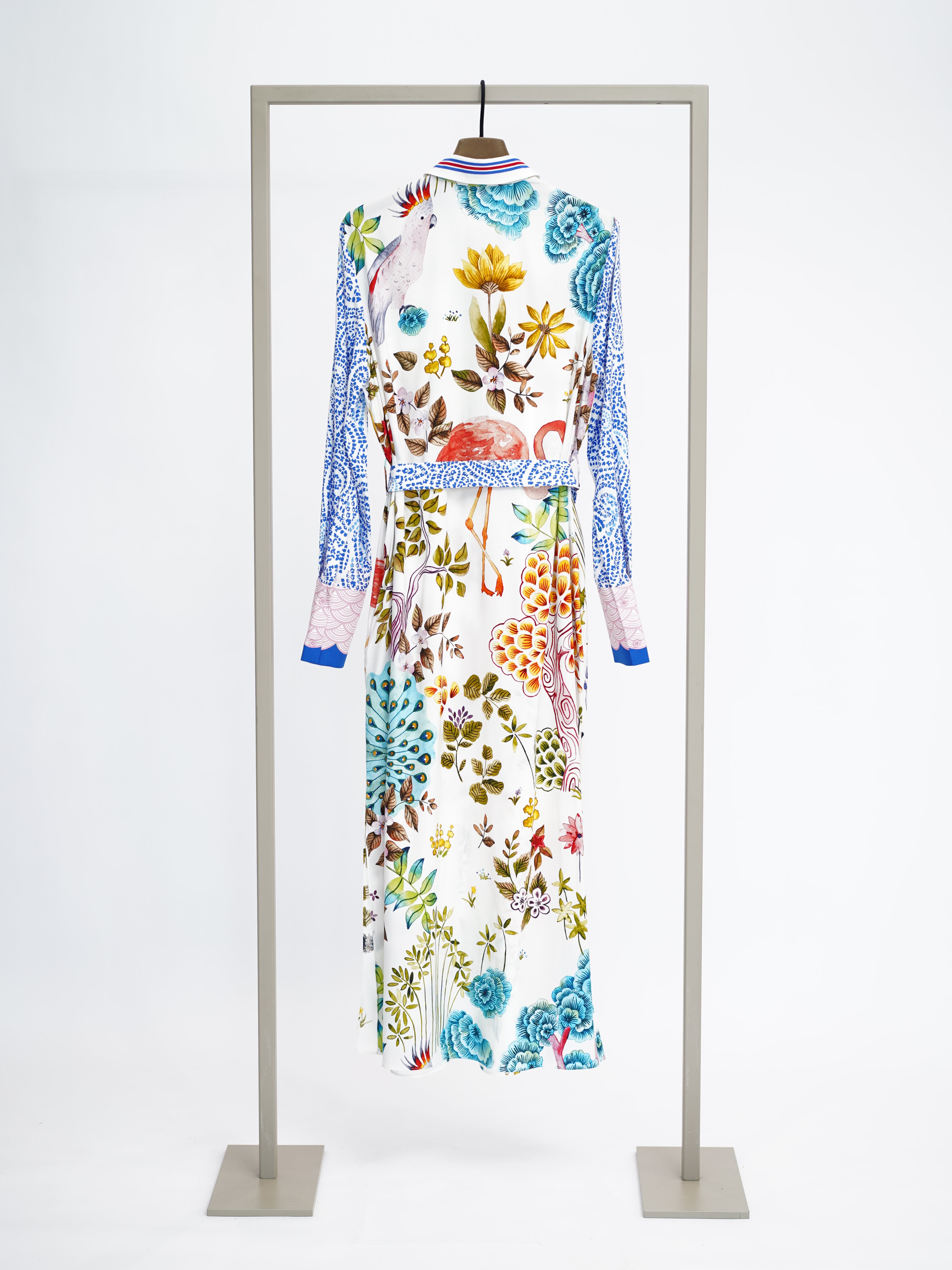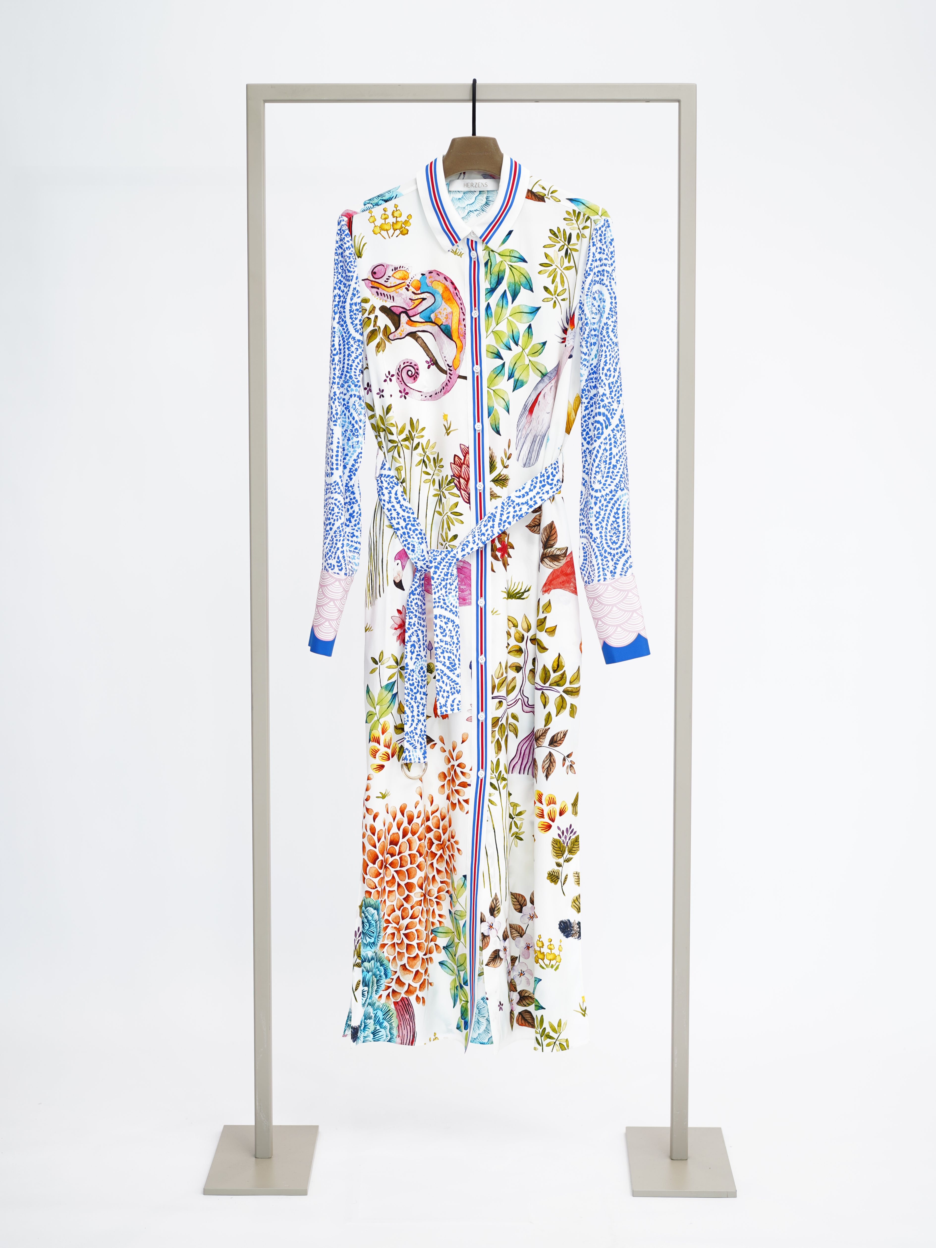 Deze kleurrijke maxi-jurk van Herzens is uitgevoerd in een all-over meerkleurig dessin op een witte basis. De jurk heeft de stijl van een blousejurk met een klassieke kraag en een doorlopende knoopsluiting aan de voorzijde. Het dessin toont een combinatie van levendige botanische elementen, bloemen en dierfiguren. De lange dames jurk is voorzien van lange mouwen die eindigen in een manchet en wordt geaccentueerd door een afneembare, geprinte stoffen ceintuur in blauwtinten.