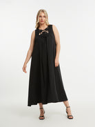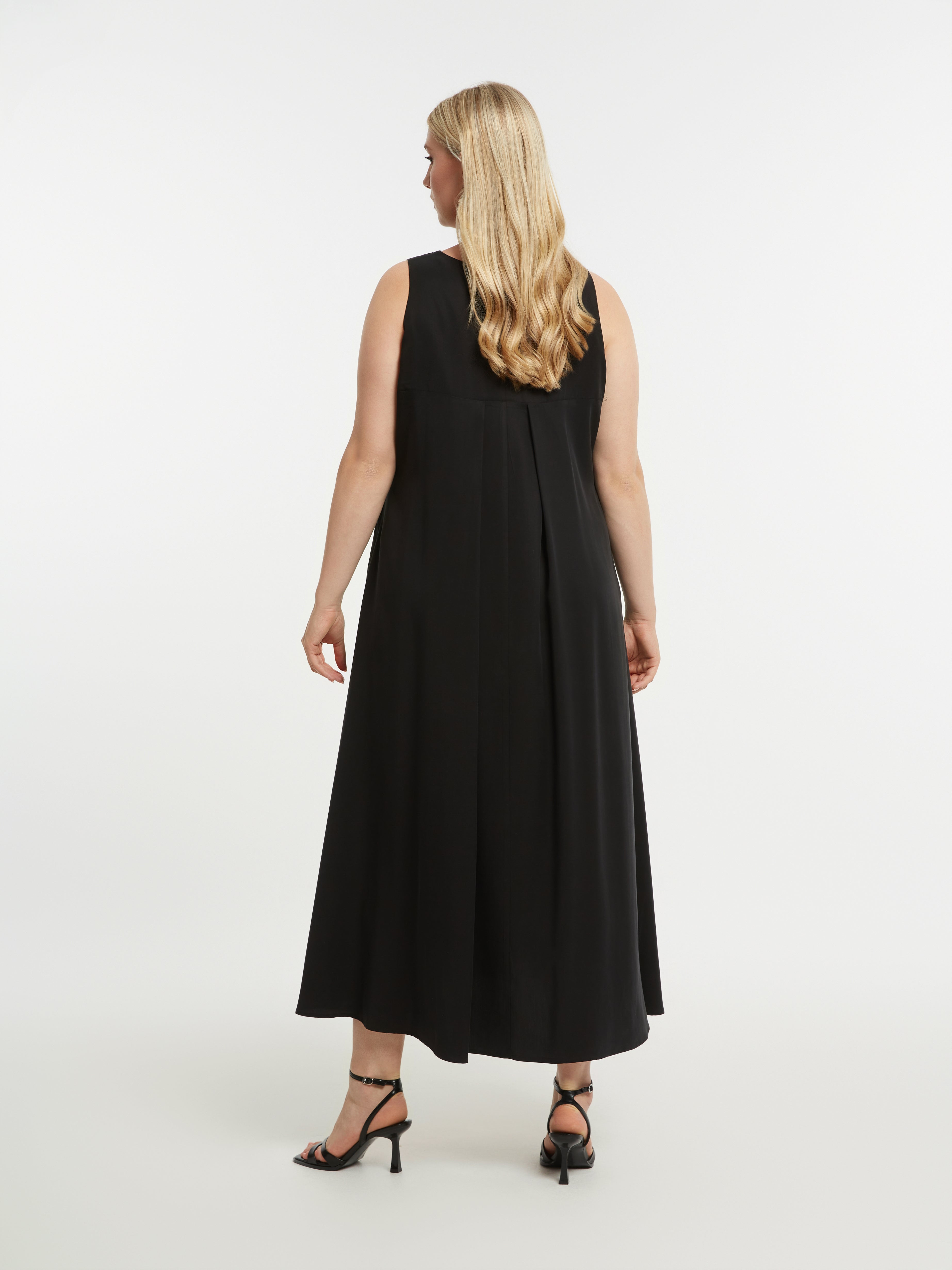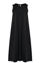 Deze mouwloze zwarte maxi-jurk van MAT heeft een wijde A-lijn pasvorm, ideaal voor een relaxte look. De ronde halslijn wordt gekenmerkt door een opvallend decoratief bloemenappliqué. Deze lange jurk valt soepel en is perfect als stijlvolle zomerjurk of voor een meer geklede gelegenheid. Door de nuchtere uitstraling van het merk MAT combineer je dit kledingstuk makkelijk met andere items uit je garderobe.