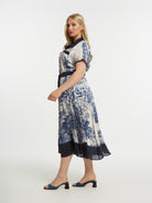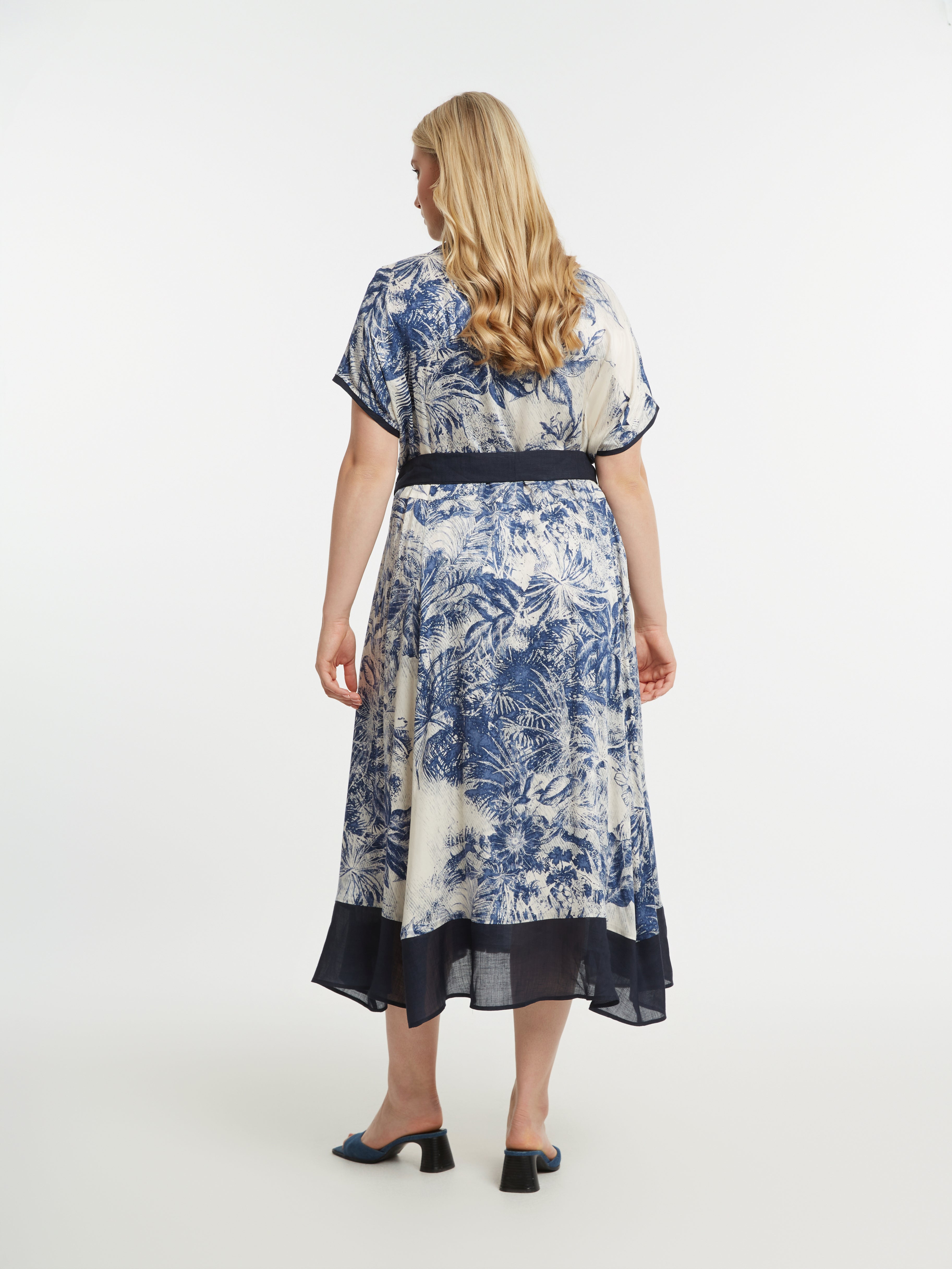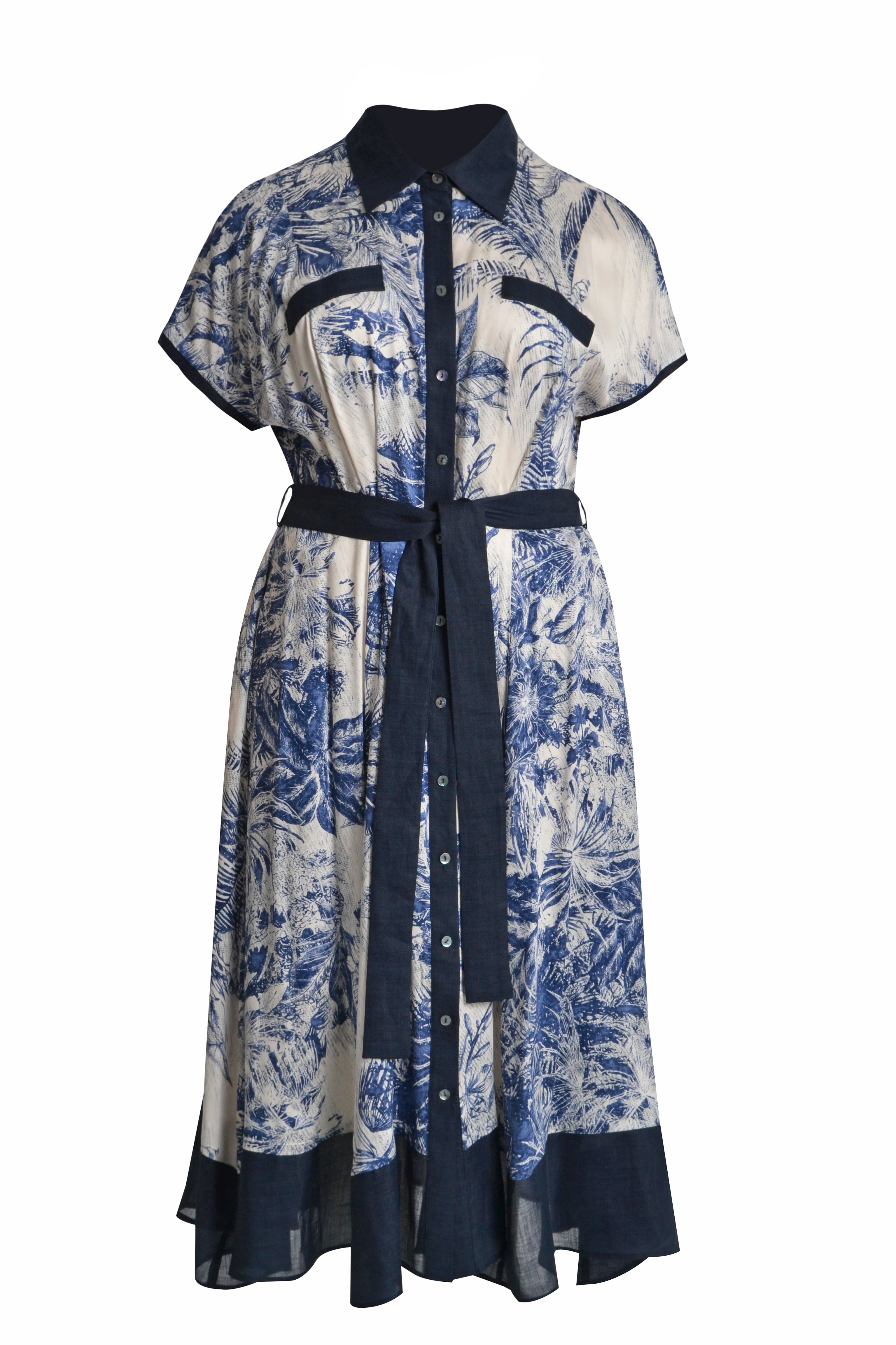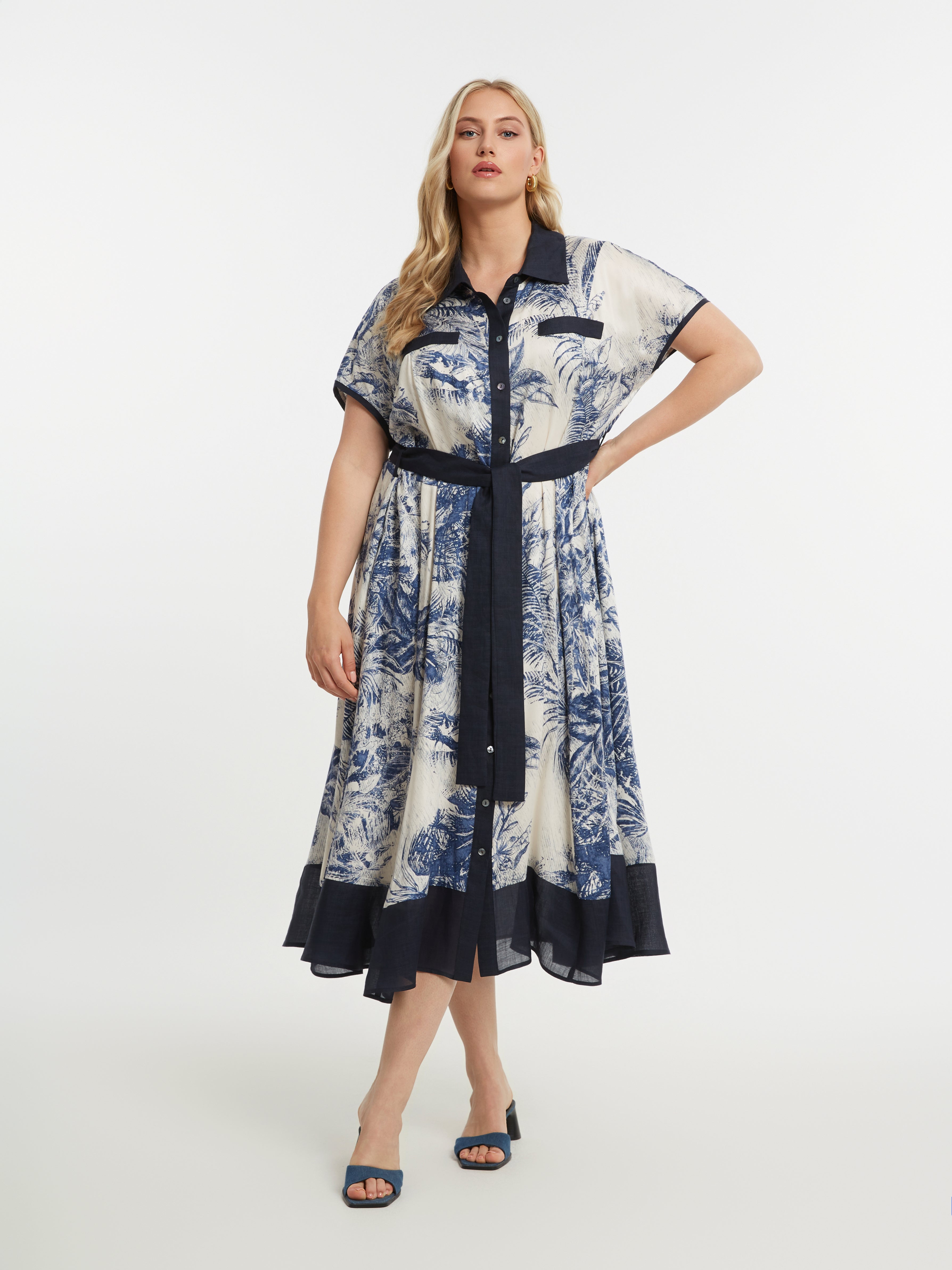 Deze MAT midi-jurk in Blauw en Crème is uitgevoerd met een tropisch dessin. De jurk heeft korte, aangeknipte mouwen en is voorzien van een klassieke reverskraag. Je sluit deze moderne overhemdjurk met een doorlopende knoopsluiting aan de voorzijde. Het kledingstuk is afgewerkt met een donkerblauwe bies aan de zoom en heeft een bijpassend ceintuur in dezelfde kleur, wat zorgt voor een casual uitstraling.